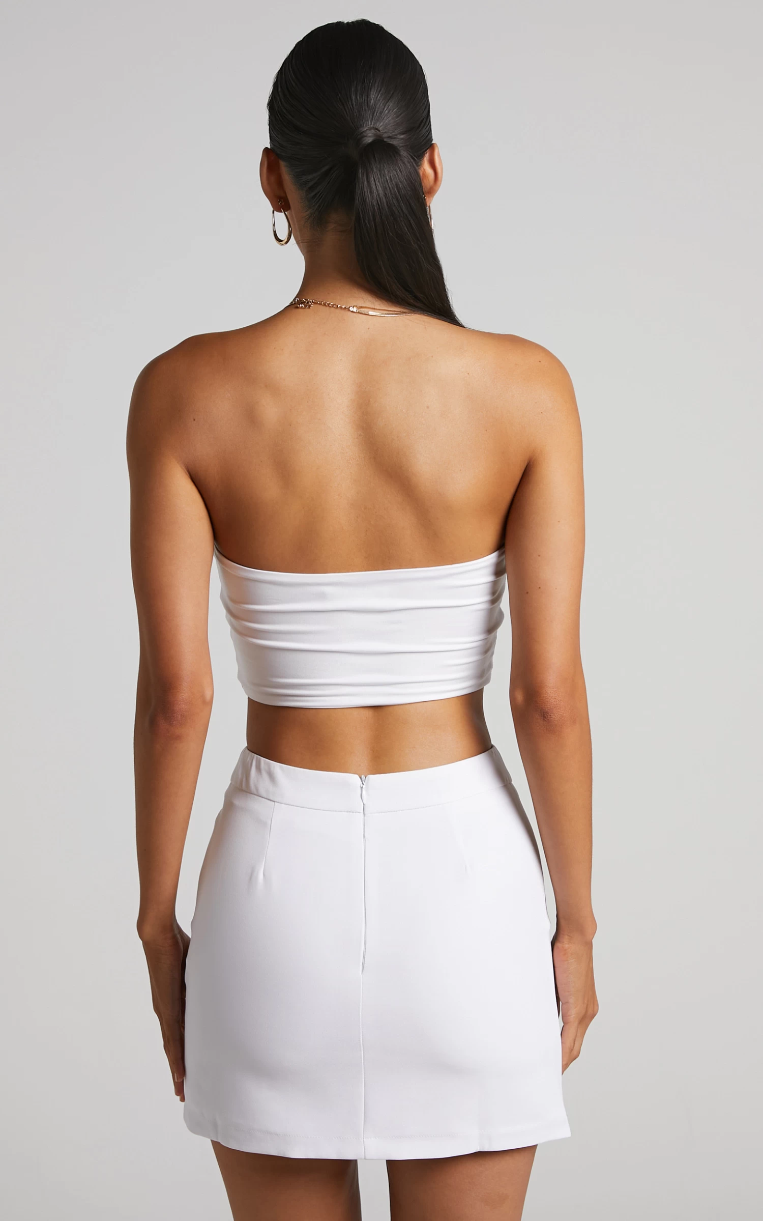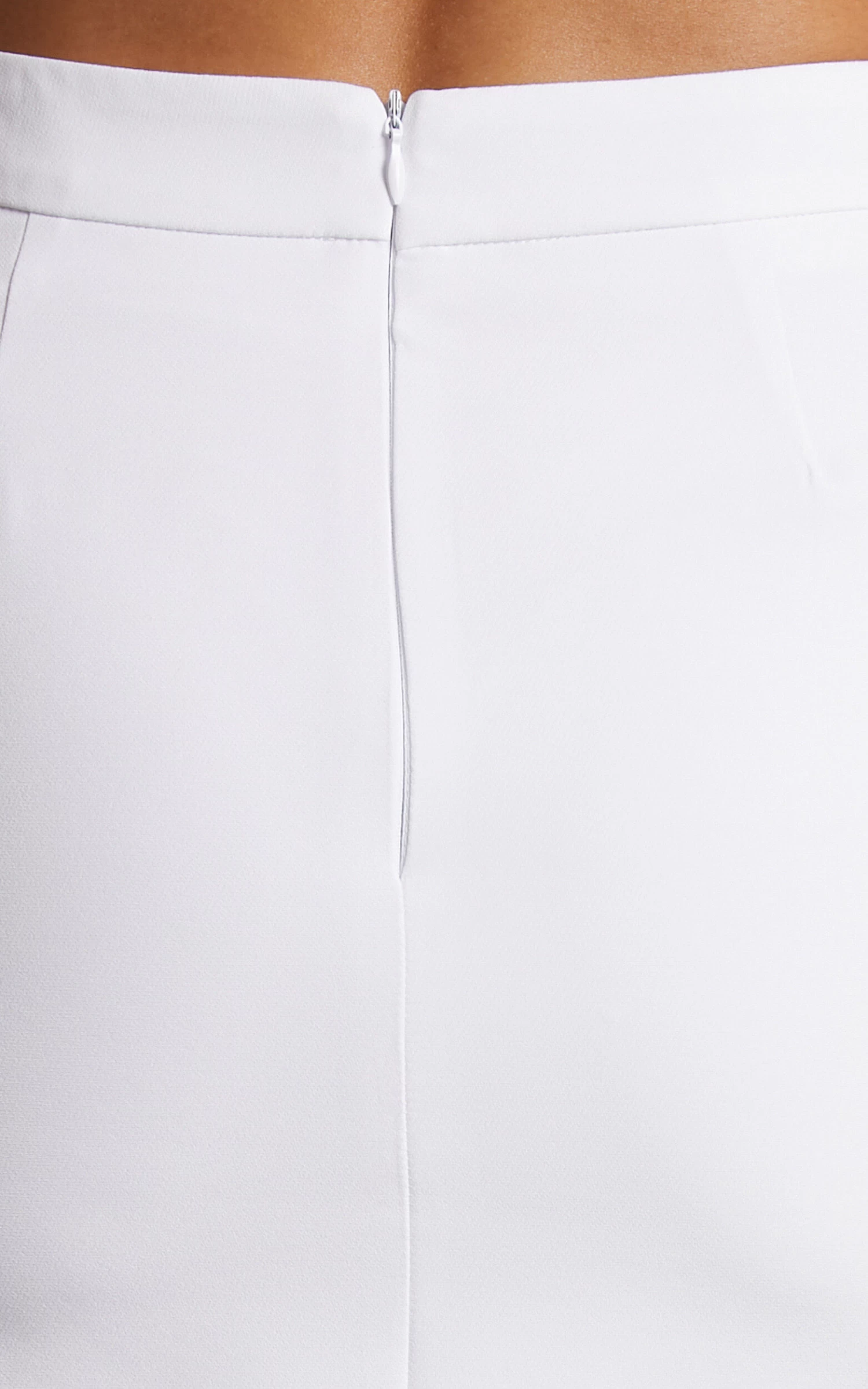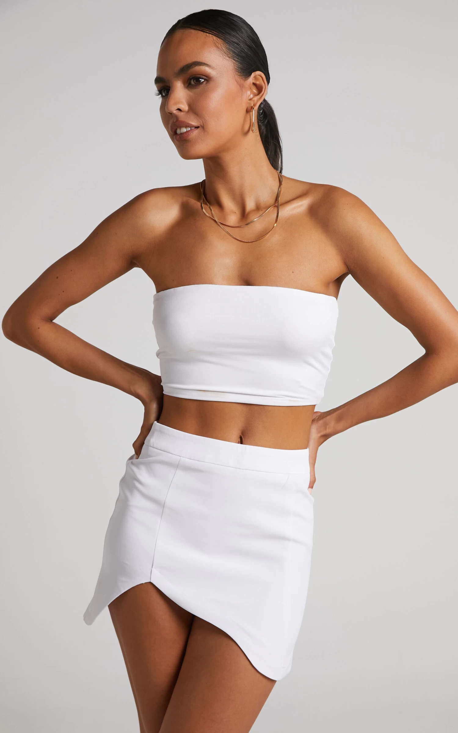Make waves this season in our Abril Mini Skirt! This simple but stunning mini features a unique wave-like curved hem that will make any outfit stand out. Style it with a strapless bandeau top, stiletto heels and sleek jewellery for a fresh party look!