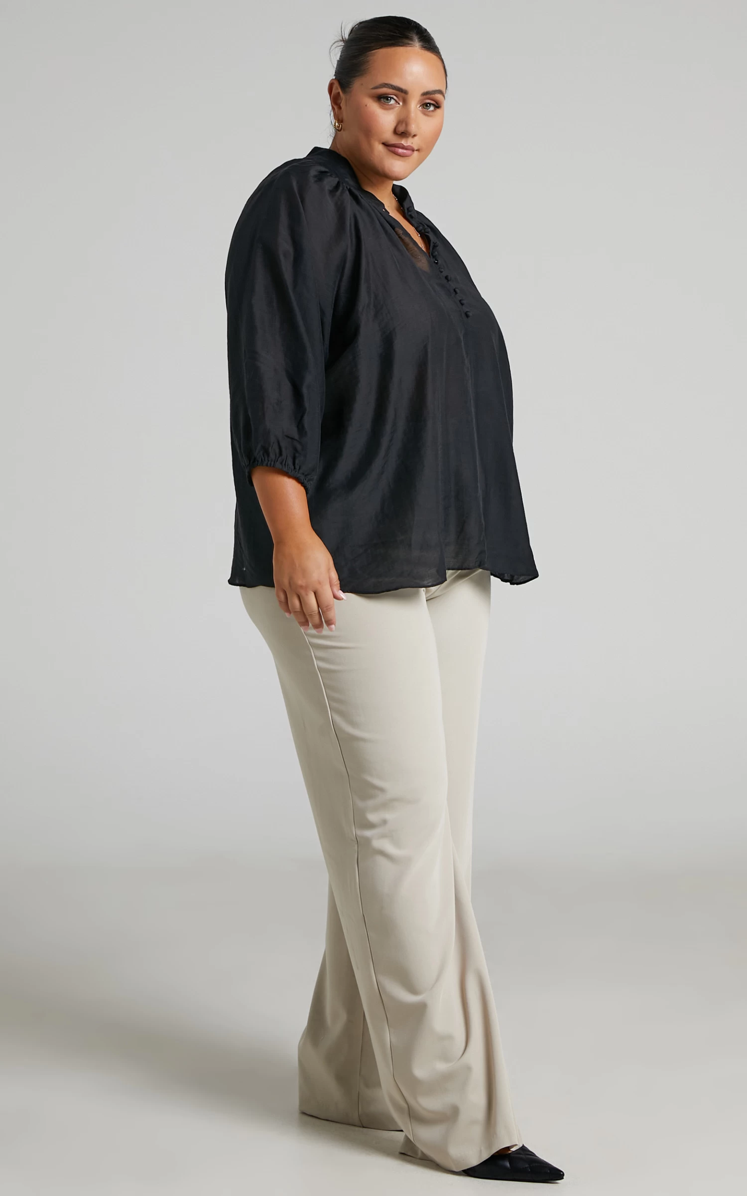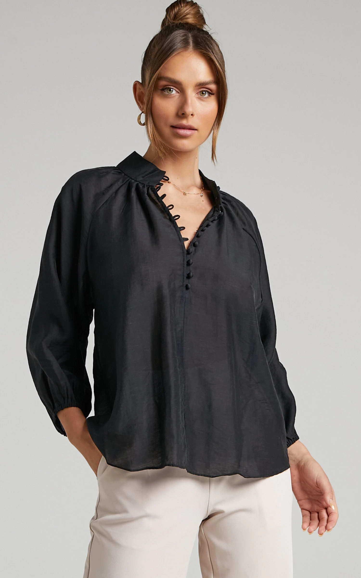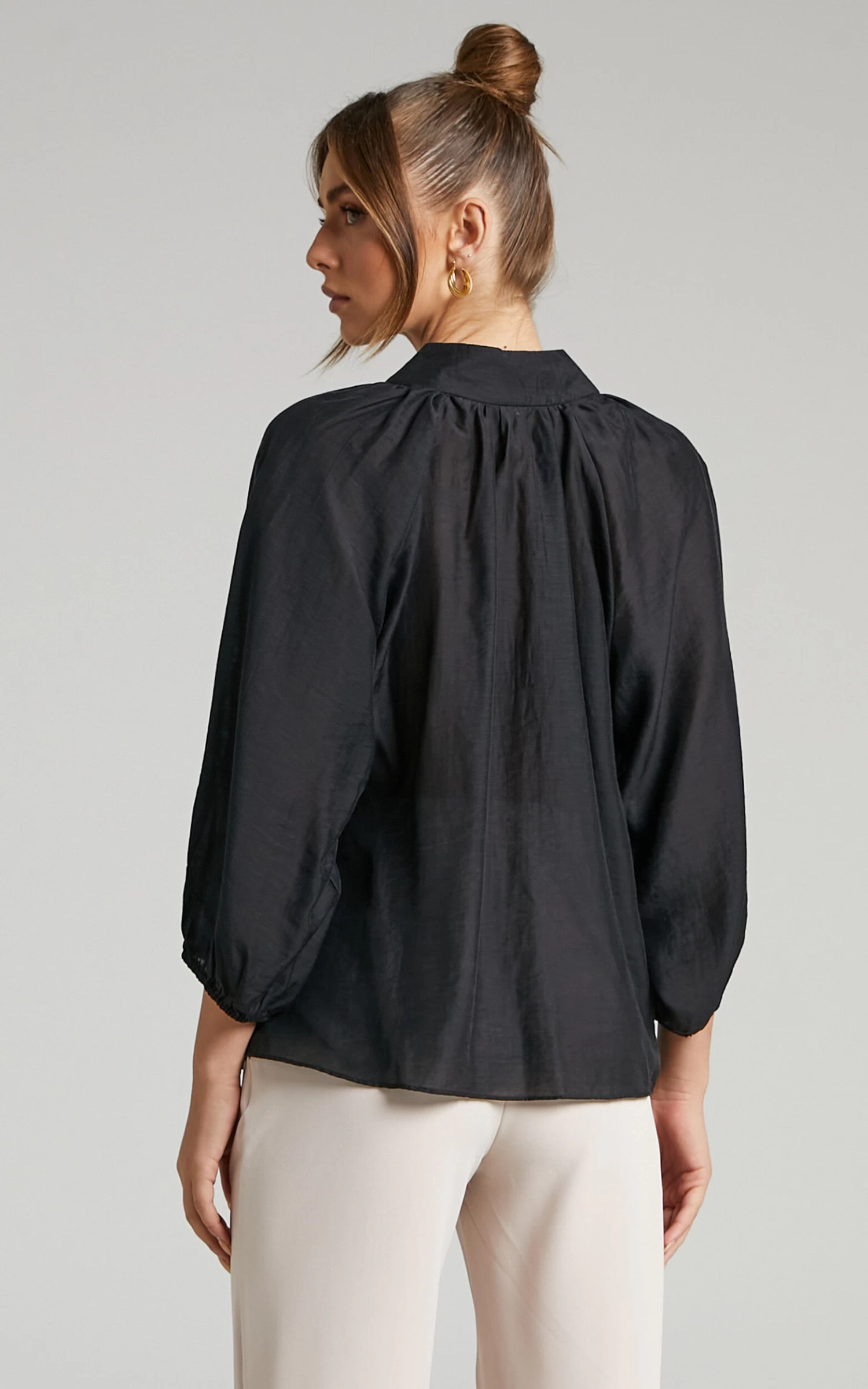 Keep the vibes chic and classy at work with our Aida Blouse! This pretty number features a high neckline, a button up front, 3/4 length sleeves and a relaxed fit. It’s such an easy breezy piece that’ll have you looking oh-so-stylish in the office. Wear it tucked into some high waist trousers or a skirt and style it with pumps, hoops and a handbag!