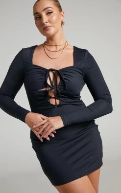 Show off your figure in ultimate form with the Aiza Bodycon Mini Dress! This simple yet sleek little black dress is perfect for nights out! It’s defined with rouleau straps on the centre front that accentuate the ruched bust and cut out detail. Long fitted sleeves frame its sweetheart neckline and then it finishes with an eye catching open back cut out! Finish your look with a slick bun and towering stilettos for a night out in town!