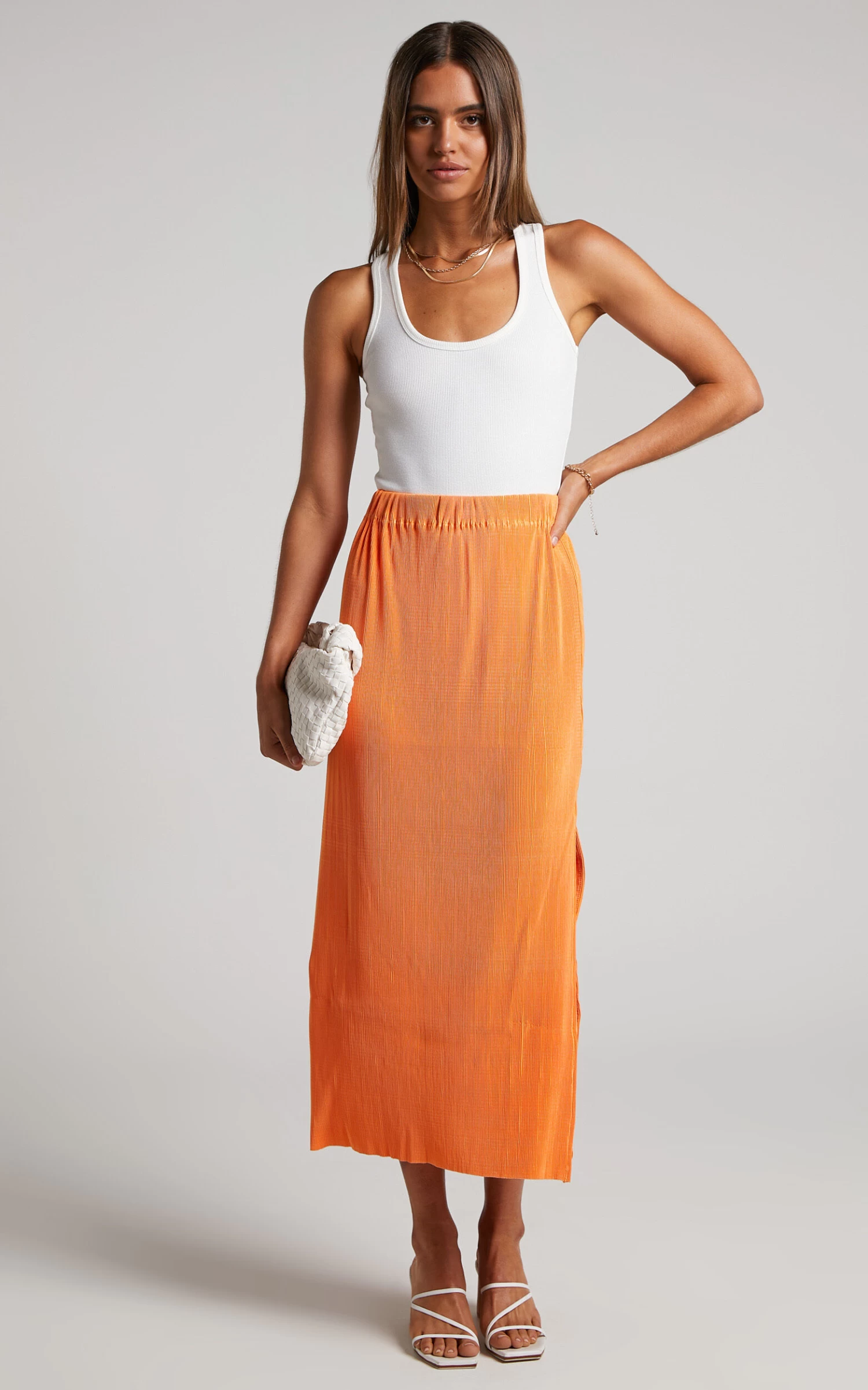 We can’t get enough of plisse pieces and the Amarante Skirt is our newest fave! Featuring an elasticated waistband, side split and textured plisse finish, this bold orange number is pure spring-summer perfection. Seriously.