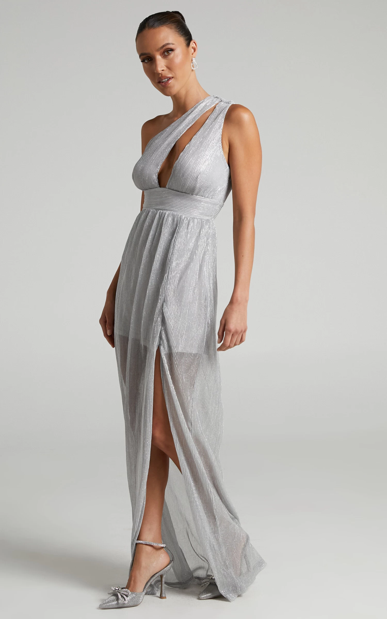 Set the bar high at all your RSVPs with our Anicee Dress! This luxe maxi is the dress of your dreams. It features an asymmetric neckline, one shoulder design with a cut out from the bust to shoulder, fitted waist, thigh high split and an opulent silver plisse finish. It’s a high impact ensemble that’ll do you justice at any event or occasion.