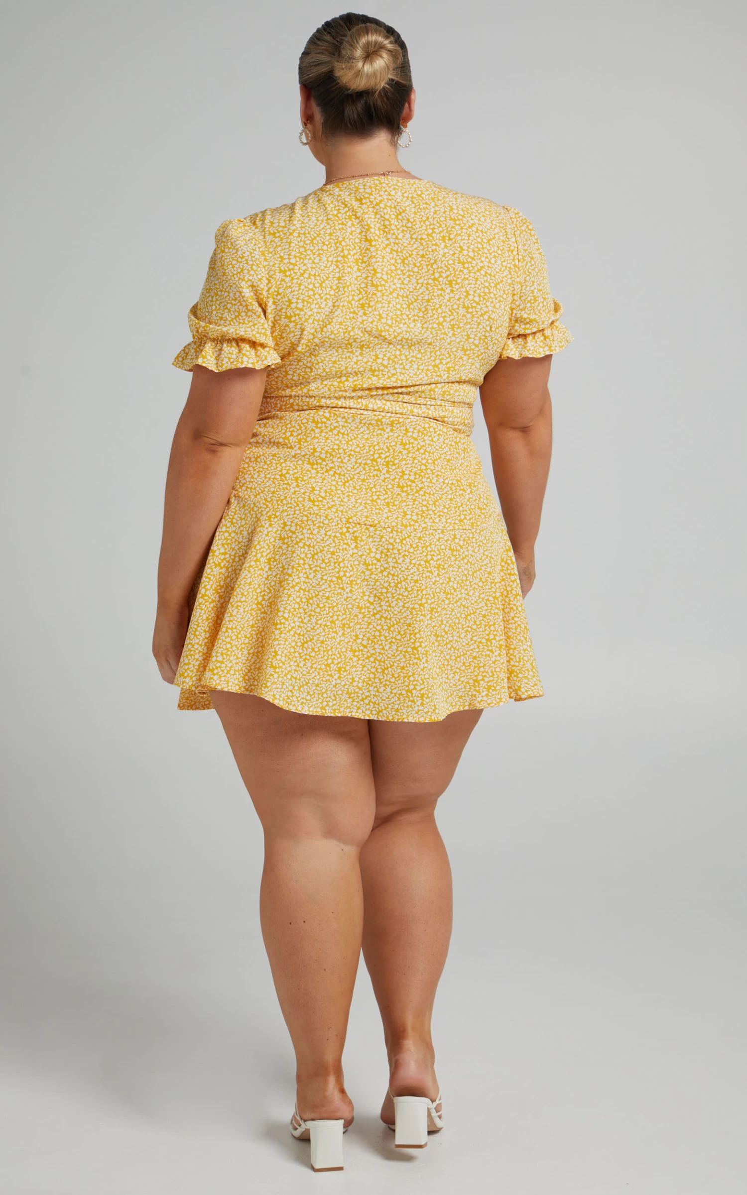 Look oh so sweet in our charming Azelle Mini Dress! This lovely little frock features a dainty floral print, short puff sleeves and a flattering wrap front design. It’s perfect for summery picnics at the park or light reading at your favourite cafe. Style it with a pair of chunky platform sandals for an extra laidback feel!