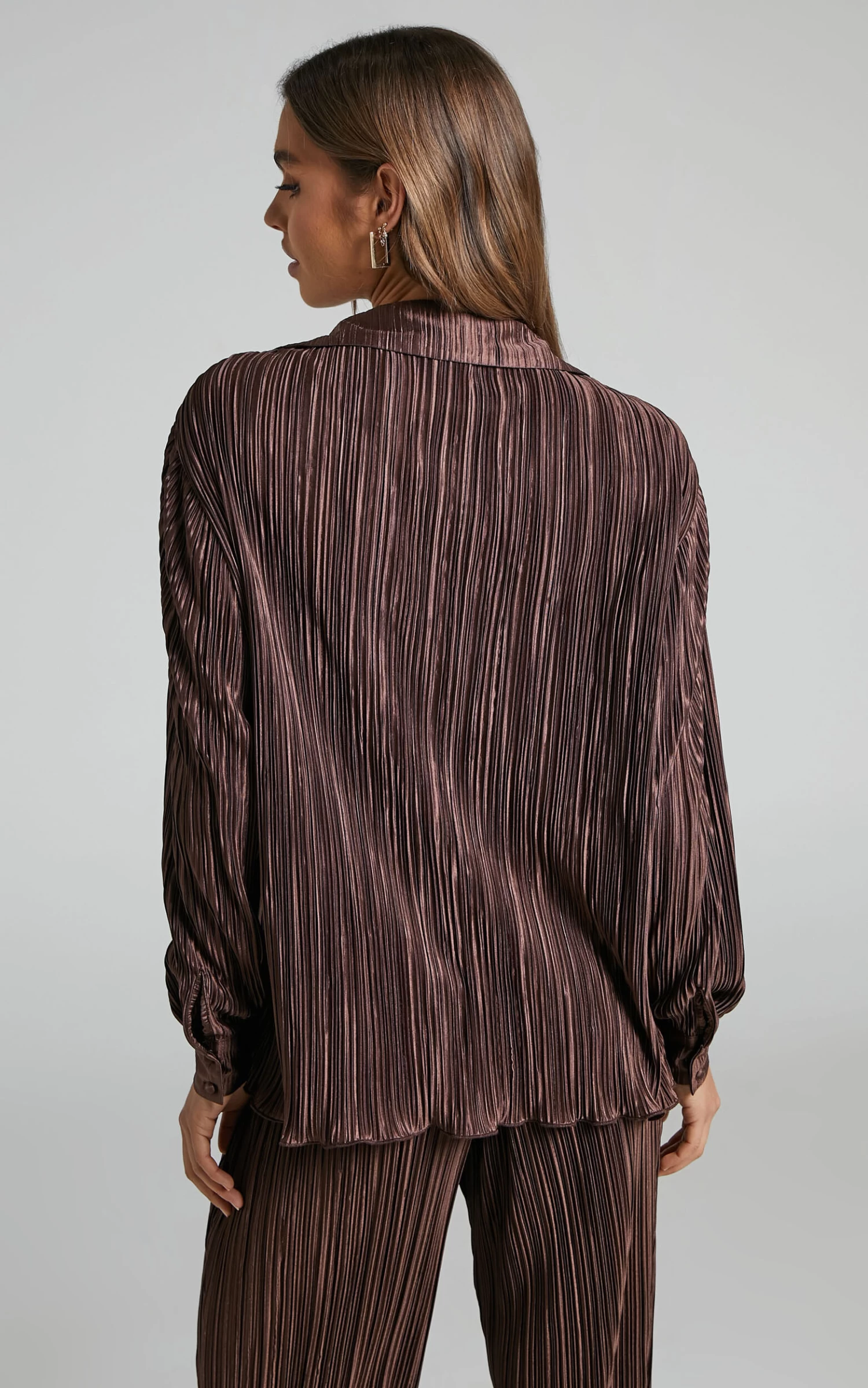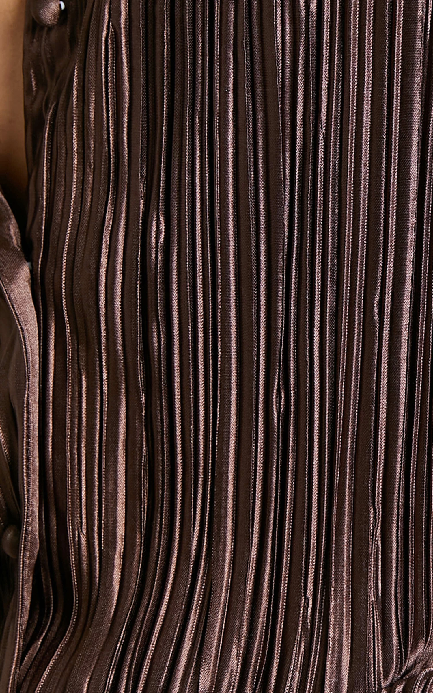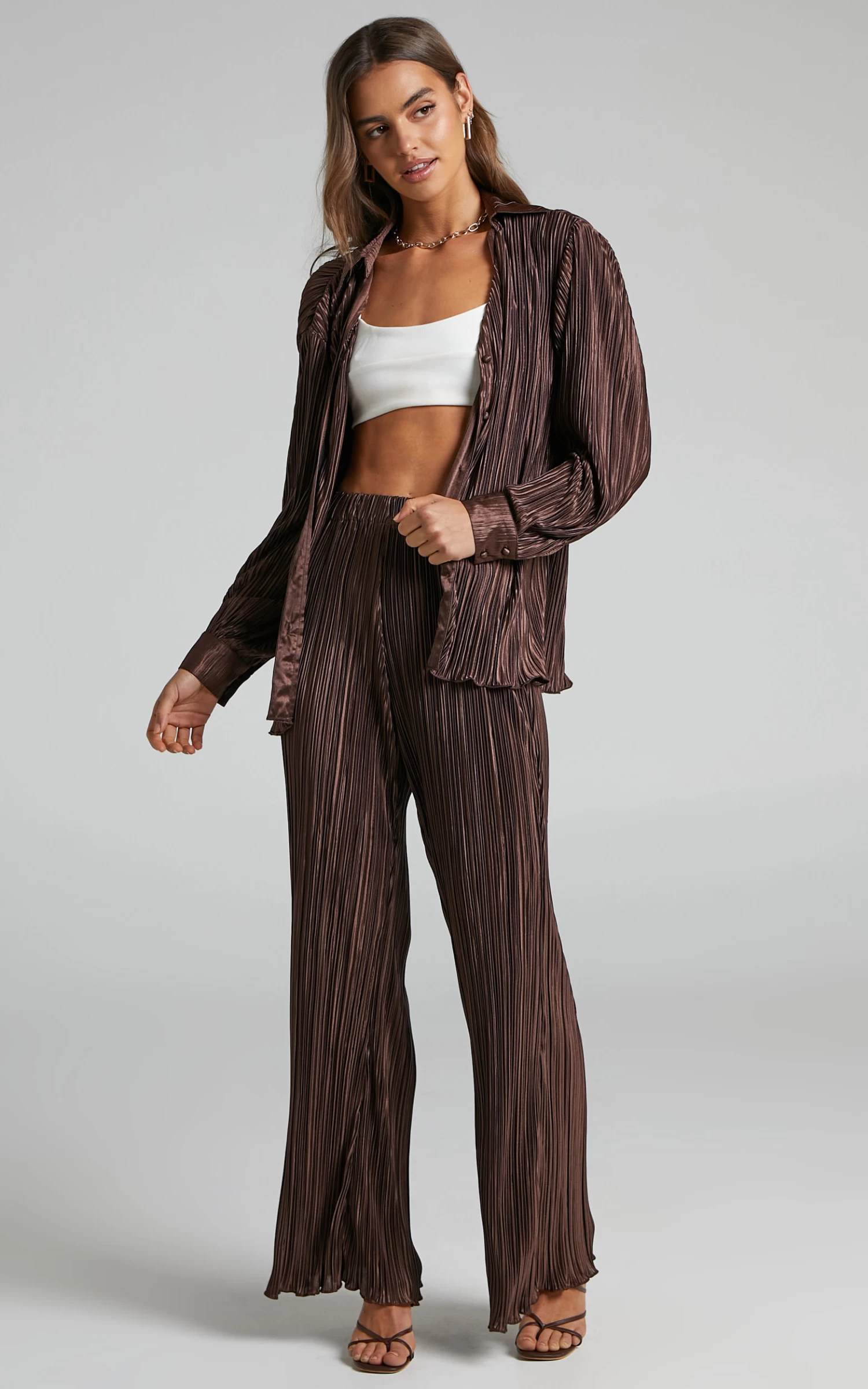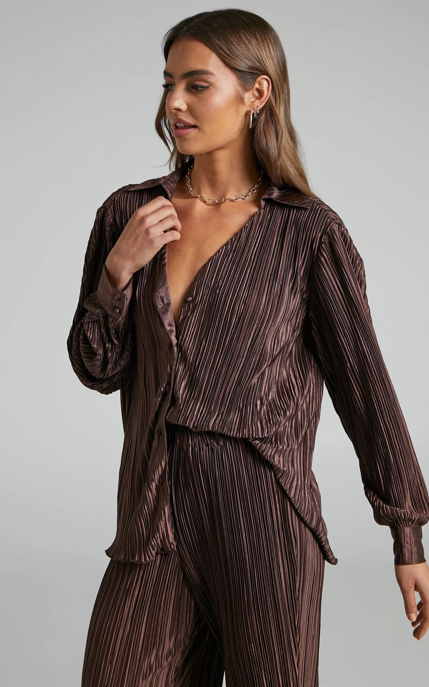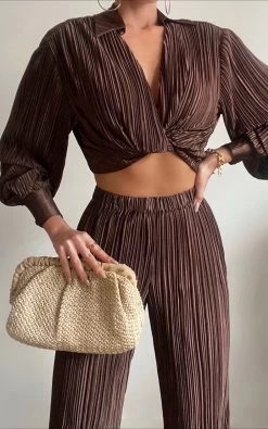 Wear this beauty with full length pants in a neutral tone or go for a glamorous co-ord look with the matching Beca Plisse Flared Pants in Chocolate, mules and the Peta and Jain – Sapphire Earrings in Gold!