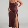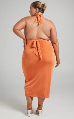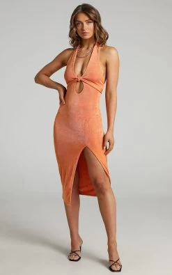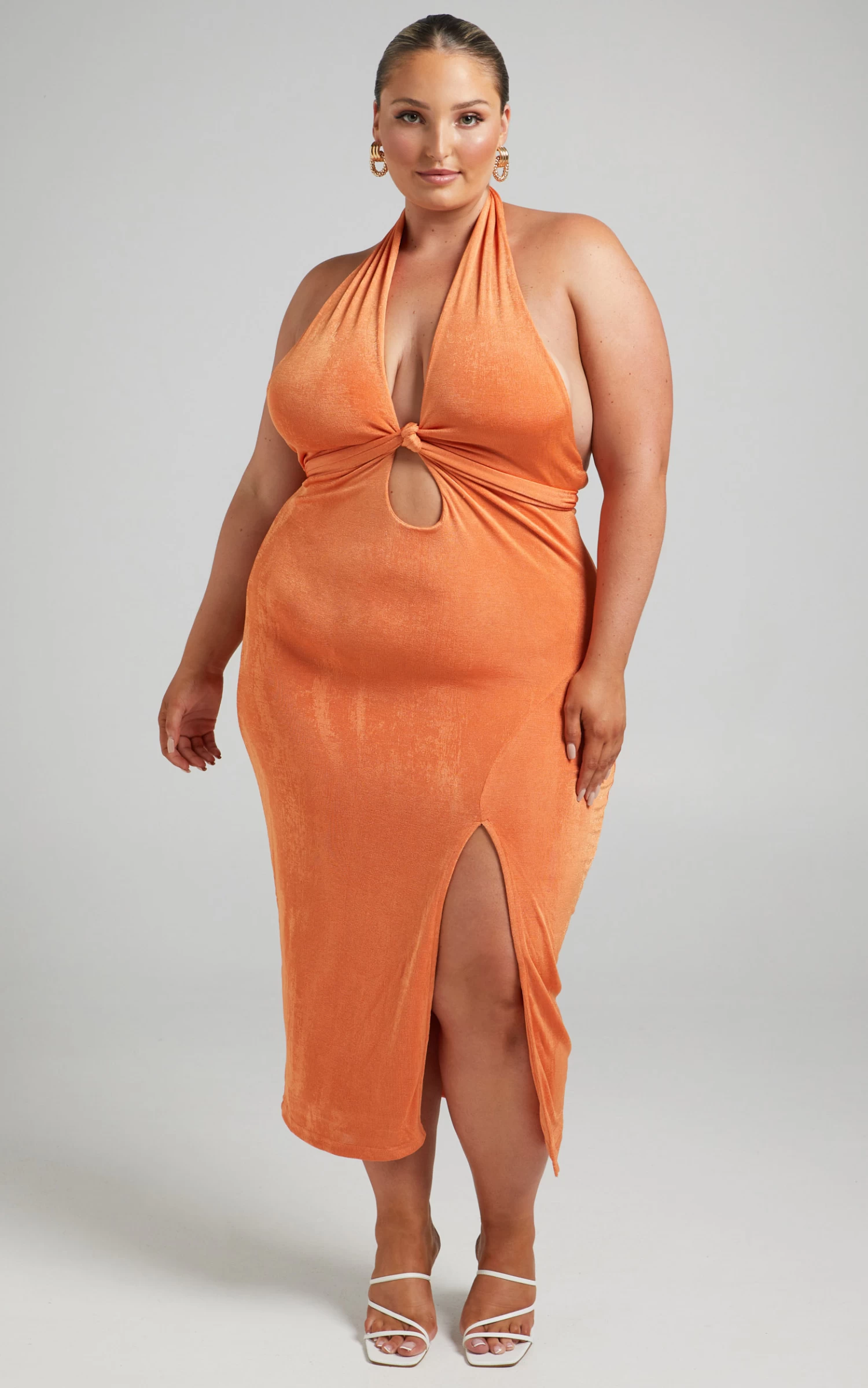 Radiate confidence in our Bethany Dress! This shimmery bodycon midi has two long ties at the bust designed to be knotted or crossed over before fastening at the back. It also features a deep V-neckline with halter straps, a circular waist cut out and a thigh split. You can’t go wrong styling it for nights out with strappy heels and bold hoops!