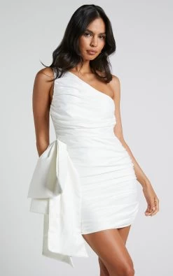 Your bridal look? All wrapped up with our Betty Side Bow Dress! This cool-girl dress is the perfect base for a ceremony and/or reception outfit to remember. Marrying a sleek one-shoulder silhouette with an oversized bow detail, it looks both traditional and unique – and will totally *pop* in the photos. Team it with dazzling high heels to complement the shorter length!