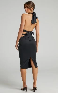 Doll up in our Bevin Waist Cutout Midi Skirt! This slinky number features a slender waistband accented with cut outs on each side at the front and back. The fitted pencil-style silhouette ends at the knee and finishes with a centre split at the back for easy movement when walking.