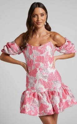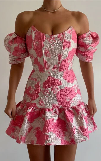 Dress like a sweet confection in our Brailey Mini Dress! This charming party number has off-the-shoulder short sleeves and a corset-style bodice with a pointed neckline. Ending in a fitted mini skirt with a ruffled hem, it’s a little bit dramatic and sure to get you noticed! Pair it with a statement mini bag and diamante-studded heels for maximum impact!Â
