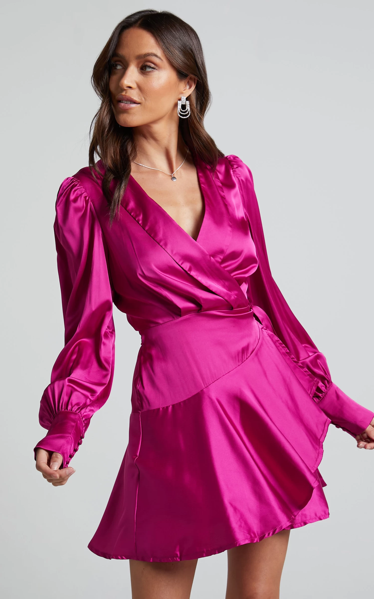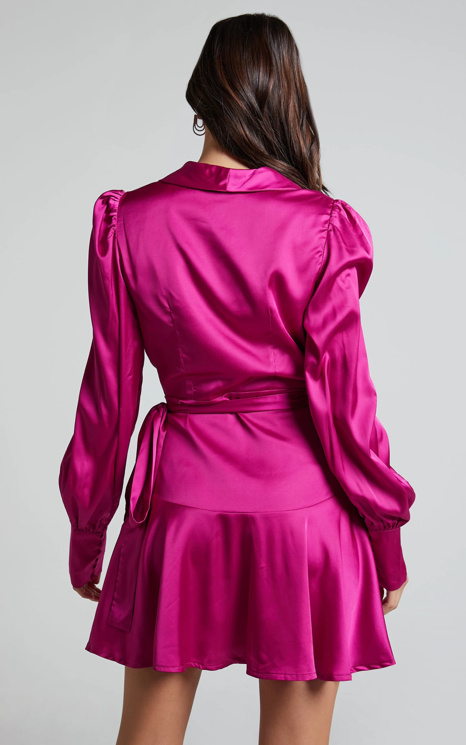 Make jaws drop in our Breeana Wrap Mini Dress! This pretty mini features a wrap front design, V-neckline, wide foldover collar and long puff sleeves. It’s super flattering on and perfect for a party or special occasion. Wear it out to a day party with heels and a mini handbag to complete the look!