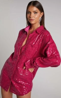 Jazz up your evening look with the Cally Shirt Dress! This glitzy number is embellished in countless sequins and designed to a shirt-style silhouette. It’s shaped with a pointed collar, button up front, curved high-low hem and long sleeves with drop shoulders. It’s the perfect statement piece to rock at parties and beyond. Style it with minimalist pumps to let the dress speak for itself!