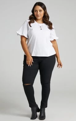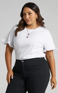 Add a new trusty white tee to your collection with the Closer to Home Ruffle Sleeve Tee! This t-shirt sports a slightly boxy but standard fit with a sweet ruffle trim on the sleeves. It’s super versatile and easy to style with anything in your wardrobe. Roll it up or tuck it into your favourite high-waisted jeans for an easy but cute day look!