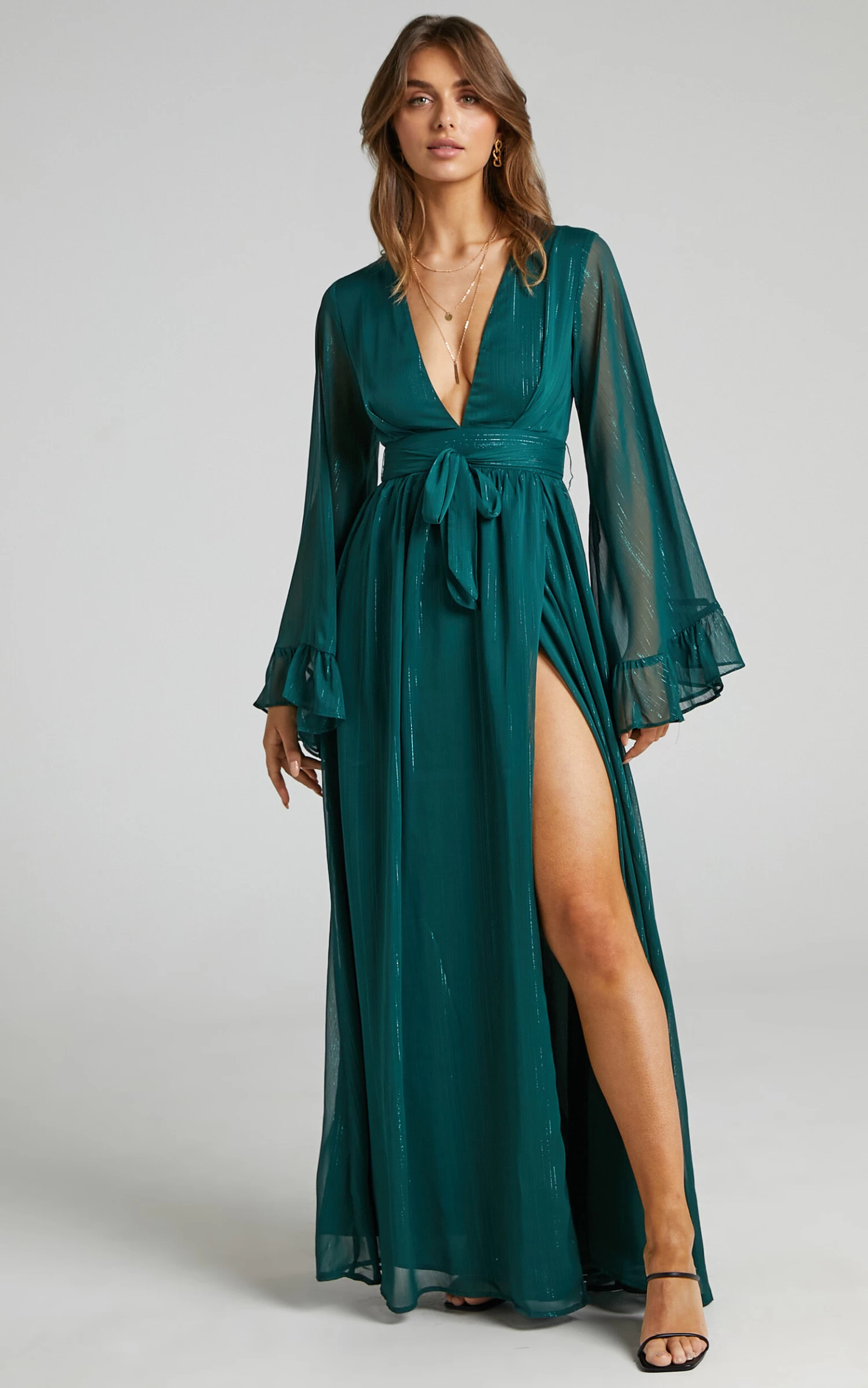 Our Dangerous Woman Dress is the hottest maxi you will ever find! Featuring a plunge neck, long sheer waterfall sleeves with ruffles and a thigh split – this piece is perfect to wear out to upcoming events and celebrations. Complete the look with some heels and a mini handbag for all eyes on you!