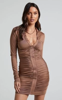 The Dulce Long Sleeve Ruched Mini Dress has just landed, and it’s the ultimate cool girl piece we know you’ve been dying to get your hands on. This sexy yet sophisticated bodycon dress features super flattering ruched detailing at the front and a sleek collared V-neck. Don this bad boy for your next GNO adventure to get the most insta-worthy OOTD shots! Combine it with some knee high boots, gold hoops and a slicked back bun for the ultimate model-off duty ensemble.