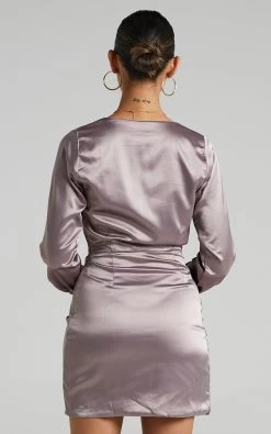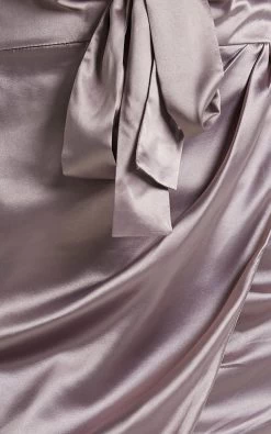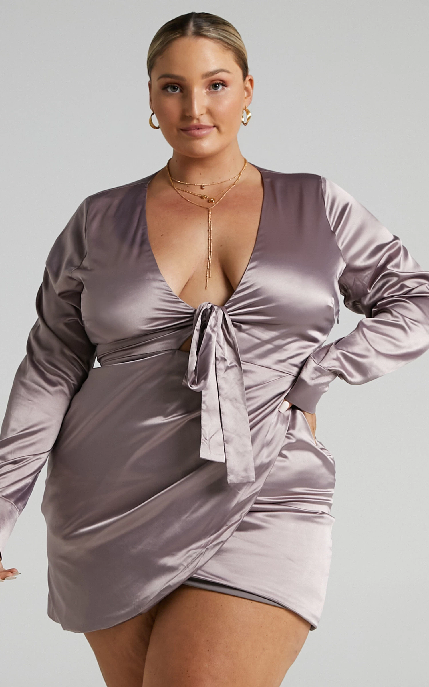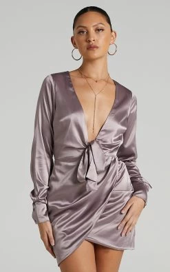 Our glamorous Dunoon Dress is made from a luxe satin-like fabric and secures with a tie wrap front. It features an inverted cut out on the waist then falls to a mini overlapping skirt with a curved hem.