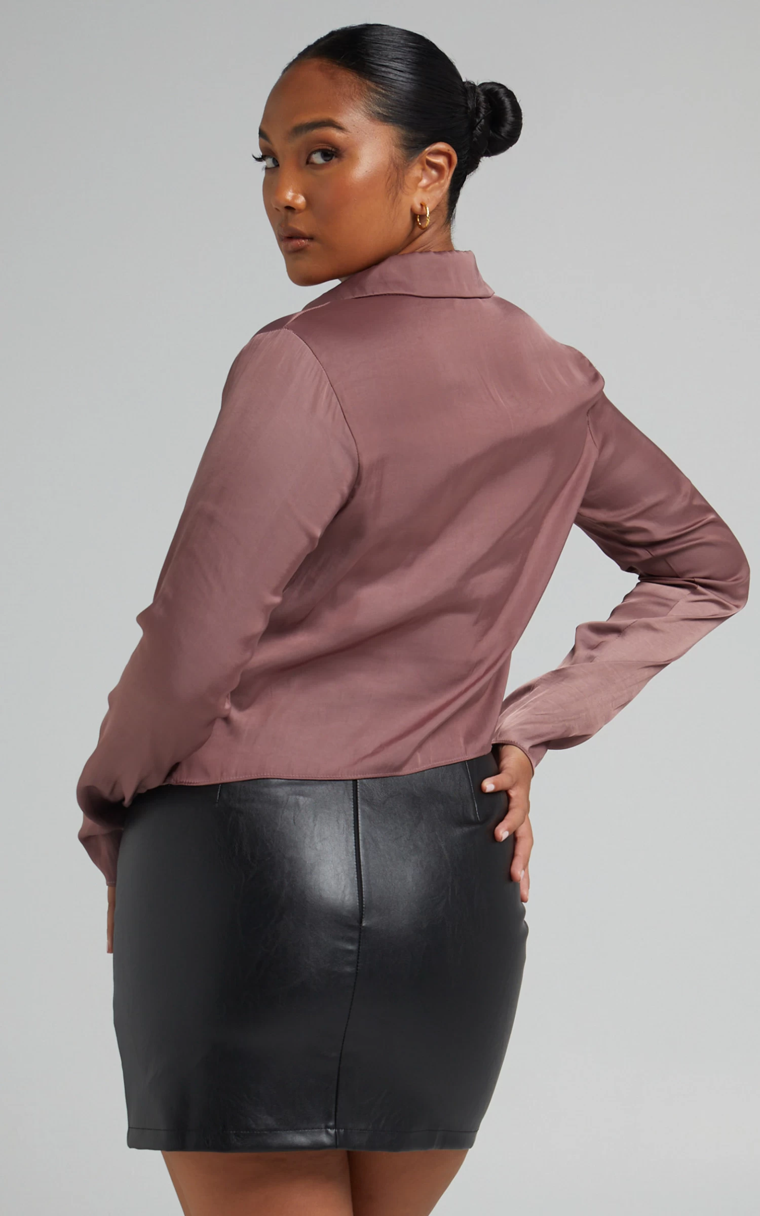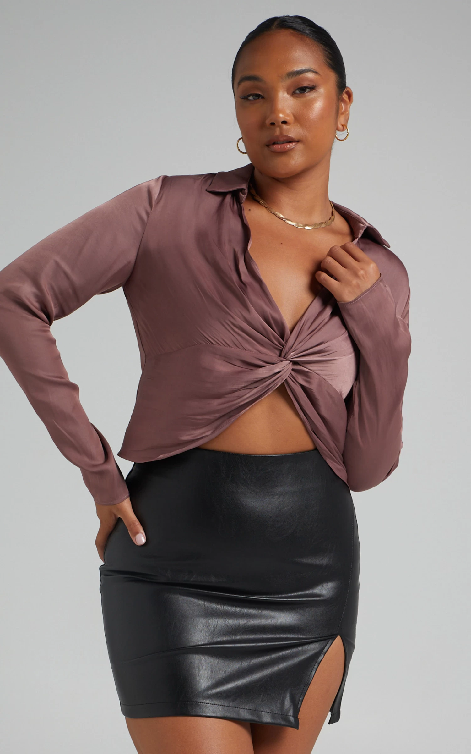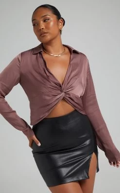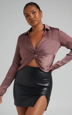 The Elexis Twist Front Top is your new go-to for going out! It’s made from a shiny luxe satin fabric and shaped with an open collar to show off a deep V-neckline. Also featuring slender long sleeves, a twist front detail and a V-cut hemline to mirror the neckline, it’s easy to wear and sure to get you noticed.