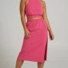 Mix and match with the Elvie Midi Skirt! This sleek and versatile piece will add an instant touch of sexiness to any outfit. Featuring a high rise waist, cutaway thigh high side split and a body-skimming fit, you can dress it up with a corset top and high heels or down with a baby tee and chunky slides. The possibilities are endless!