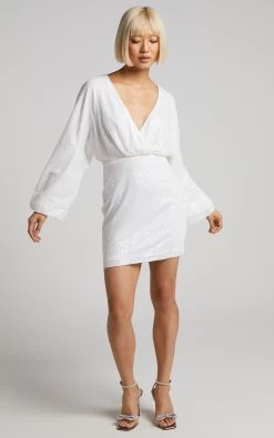 Get the party started in the Erine Dress! This luxe mini is embellished with sequins all over and features long puff sleeves, a V-neckline with a fixed wrap bodice and a fitted skirt. Add stilettos to accentuate the short silhouette and finish with drop earrings to showcase a contemporary opulence at your next party!