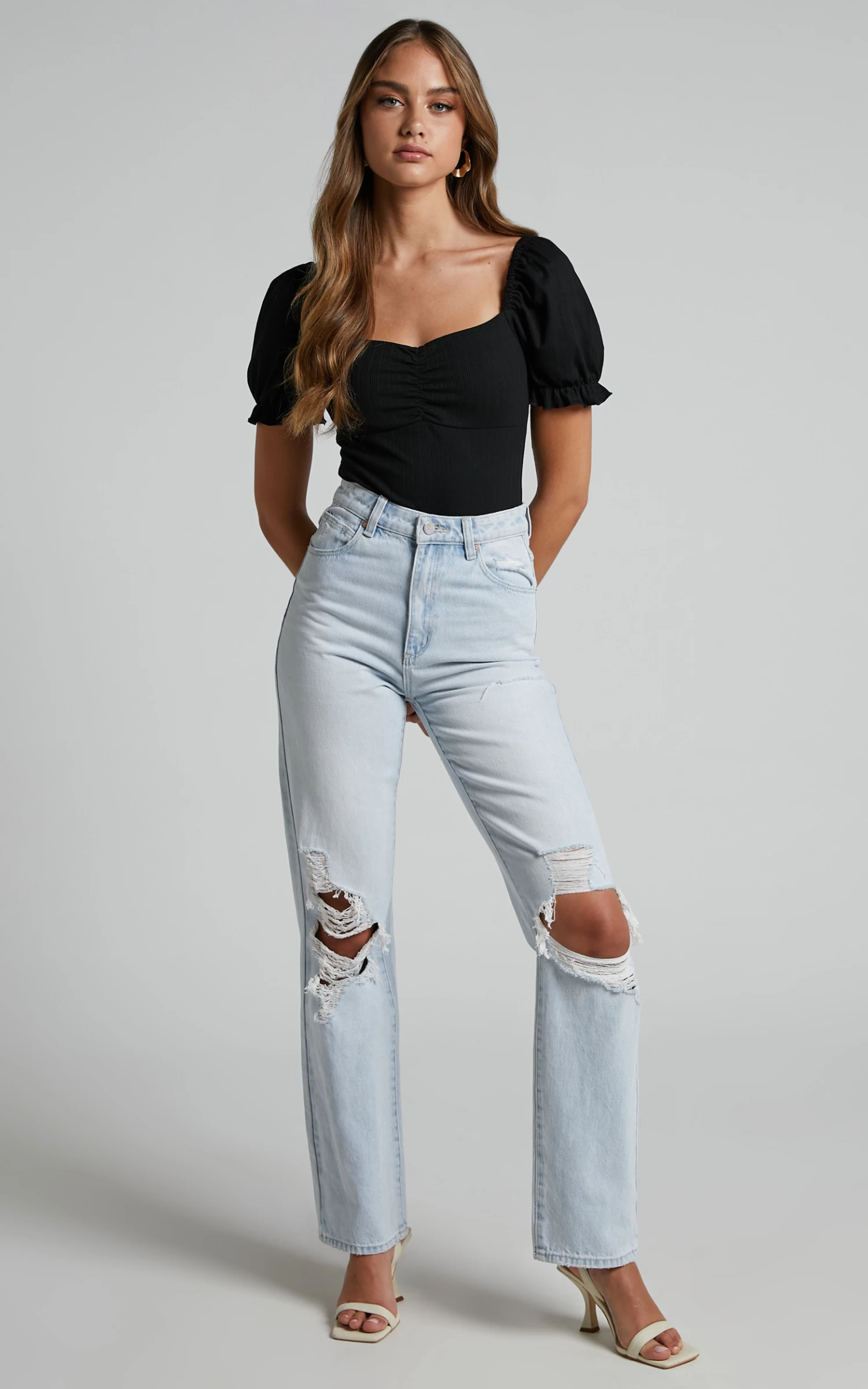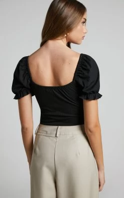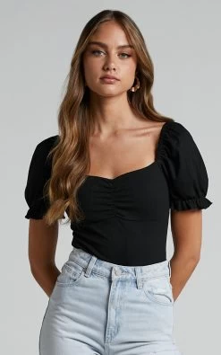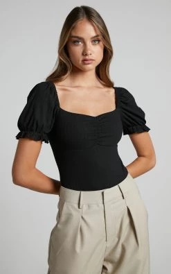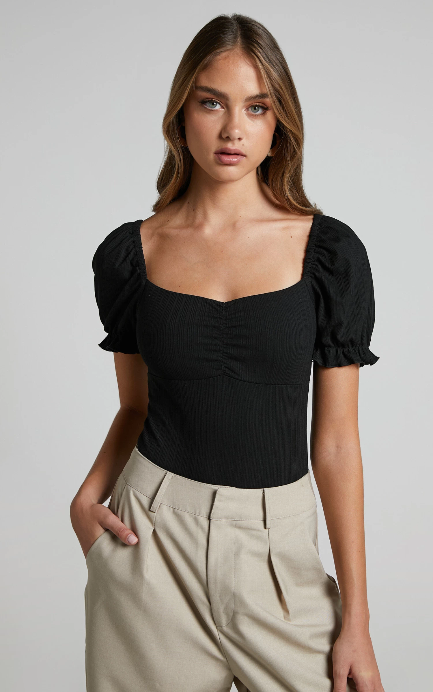 You’ll keep reaching for our Esher Bodysuit this season! This sweet piece features frilled puff sleeves, a sweetheart neckline and a fine ribbed knit finish. Made to wear on or off the shoulder, it’s a transeasonal piece that will instantly lift any outfit – casual or dressy. Go for a trendy finish with wide leg pants and heels!