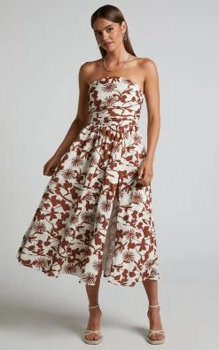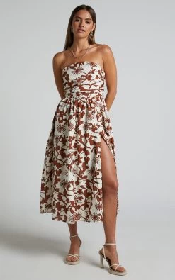 Swish your way through summer in the Evita Midi Dress! This party-ready number features a flattering A-line silhouette with a strapless bodice, ruched detail and daring front split. Finished with a bold floral print, it will boost your mood and win your compliments at that next bottomless brunch, rooftop dinner or special celebration.