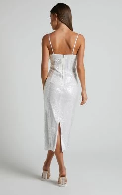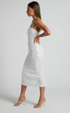 Shine bright like a diamond in our Gween Clear Sequin Sheer Midi Dress In White. This stunning slip dress is perfect for any cocktail occasion, with its straight cut and midi length that will have you looking effortlessly chic. The clear sequins add the perfect touch of sparkle to this already gorgeous dress, making sure all eyes are on you!