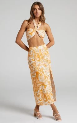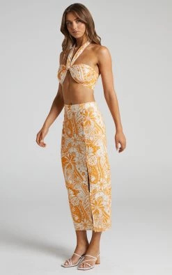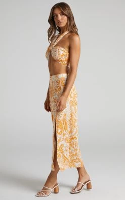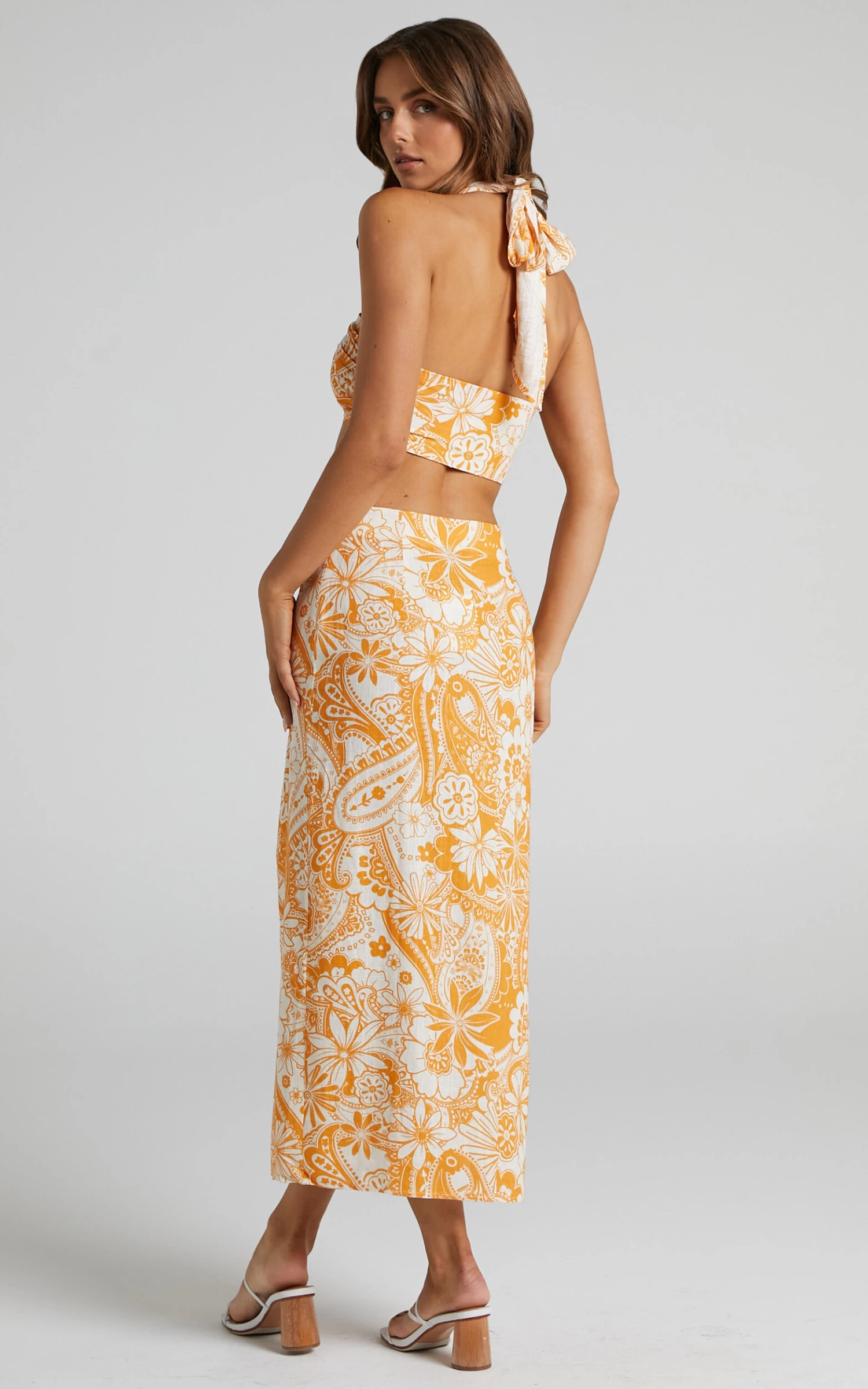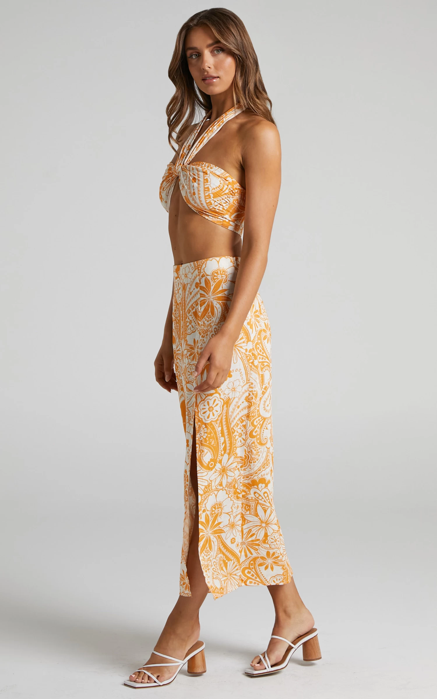 Get vacay ready with the Gyah Two Piece Set! This droolworthy ensemble is everything you want and more for summer. It features an ultra cropped top with a halter neck and twist detail, and a midi skirt with a side split. Perfect together or as separates, you can wear this set with your favourite block heels and hoops!