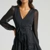 Work it in the Hayami Mini Dress! This contemporary piece highlights a wrap-style front design, wide notched collar, and long sleeves with split cuffs. It’s a chic and sleek piece that’ll have you looking polished all day and all night.Â