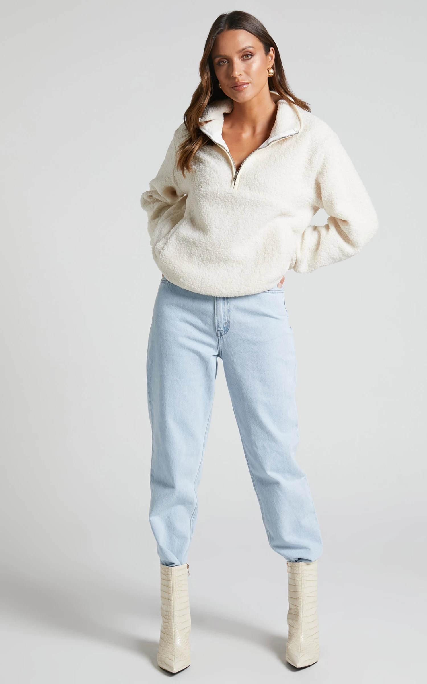 Be as cosy as can be in the Holly Jumper! This fuzzy teddy jumper features a quarter zip front, collared neckline, long sleeves and drop shoulders. She’s cute, comfy and perfect to wear throughout the new season.