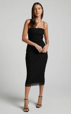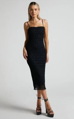 Looking for a dress that’s equal parts chic and edgy? Look no further than the Jordana Mesh Burnout Midi Dress in Black. This sultry cocktail dress features a black mesh burnout overlay, adding texture and depth to the classic midi silhouette. With its sleek straight neckline and sleeveless design, this dress is perfect for any party or festival occasion.