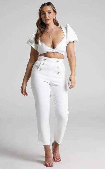 Look chic and put together in the Kaituo Two Piece Set! These coordinates feature a crop top with structured voluminous sleeves and straight leg trousers with the classiest button detailing. It’s the perfect set to wear to any smart casual event all spring-summer long! Style it with a pair of statement heels and layered necklaces to finish off the fit!