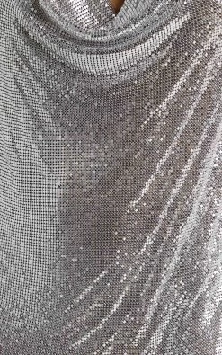 Add a 70s flare to your next night out in this Studio 54 disco-inspired mini dress! The Kaylah Cowl Mesh Dress is made from a glistening silver metallic mesh making it the perfect club number. It’s shaped with a draped cowl neckline that suspends from crystal halterneck straps that cross over at the back. The back reveals an open cut out highlighting a low drape before falling to an ultra-mini length hem complete with riveting hip-high splits on each side.