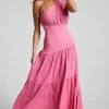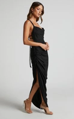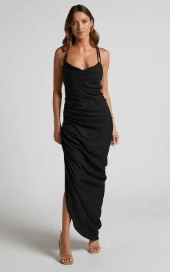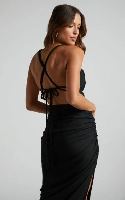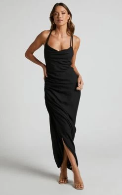You won’t slip their minds in our Khari Midi Slip Dress! This structured slip dress features double shoulder straps that fasten over an open back in a stunning intersecting pattern. Below the waist, a side split is emphasised by lots of hot ruching. Style this dress to perfection for your next date night or special event with strappy heels and glam jewellery!