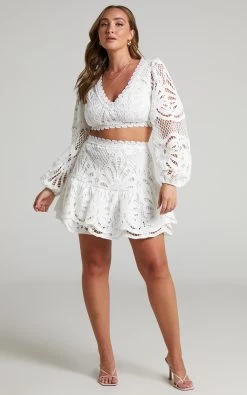 Have a romantic lace moment with our Kiss Me Softly Two Piece Set! This chic and feminine set will be a new favourite for day parties, long lunches and more. It features a long sleeve crop top with a V-neckline, lace trimming and sheer sleeves, and a mini skirt with a double layered ruffle hem. It’s a gorgeous ensemble that you’ll keep reaching for as a set or separates. Team it with some bright coloured heels, dainty jewellery and a mini handbag for a stunning look!