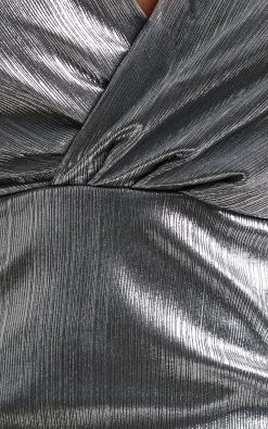 The Konoha Bodycon Mini Dress is our favourite party choice! It’s finished in a shiny metallic wet look fabric and designed to sit fitted on the body. Long draped bishop sleeves frame its plunge neckline and gathered bust. The waist is nipped then drops to a cross over mini skirt with gathered drapes and an asymmetric hem.