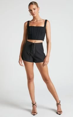 - Lace up panel with ties on centre front
