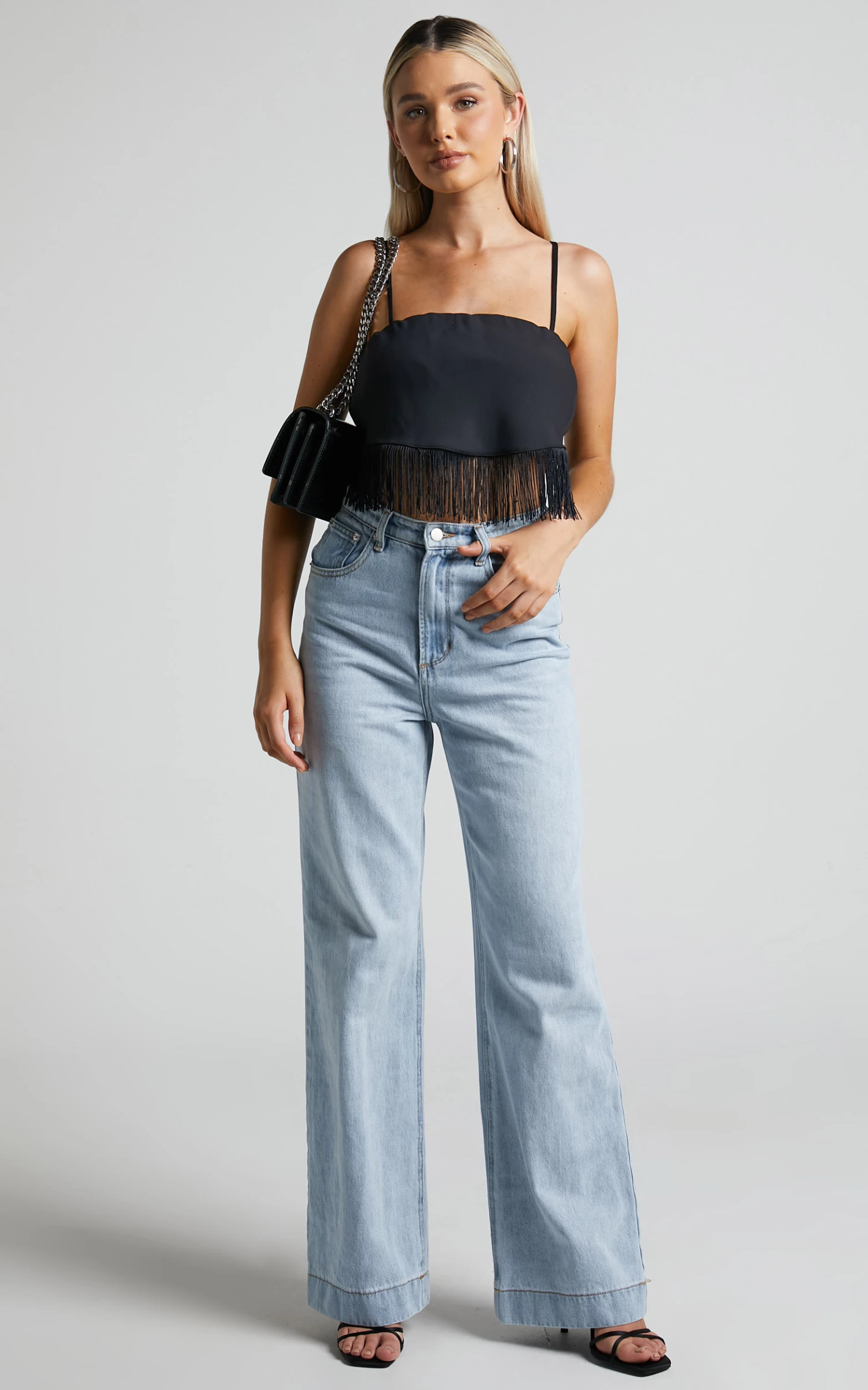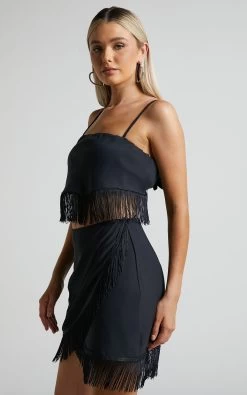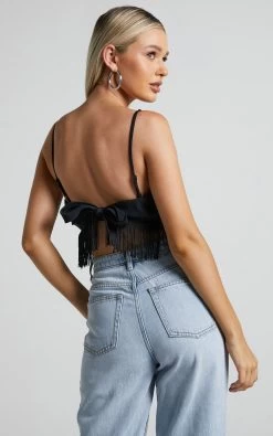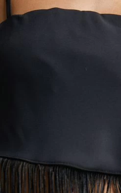 Add some playful edge to your wardrobe with the Lassey Fringe Trim Bandana Cami in Black. This trendy top is perfect for any party night or day, featuring a stylish fringe trim and bandana print that screams fashion forward. The cami style offers a straight, standard fit and sleeveless design making it an ideal piece for layering in autumn.