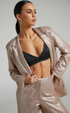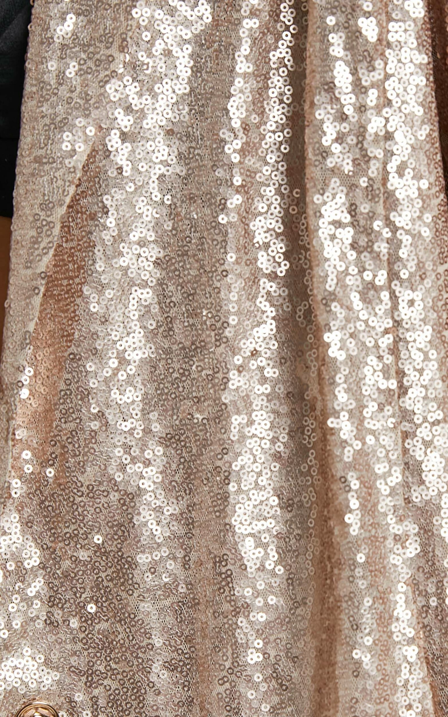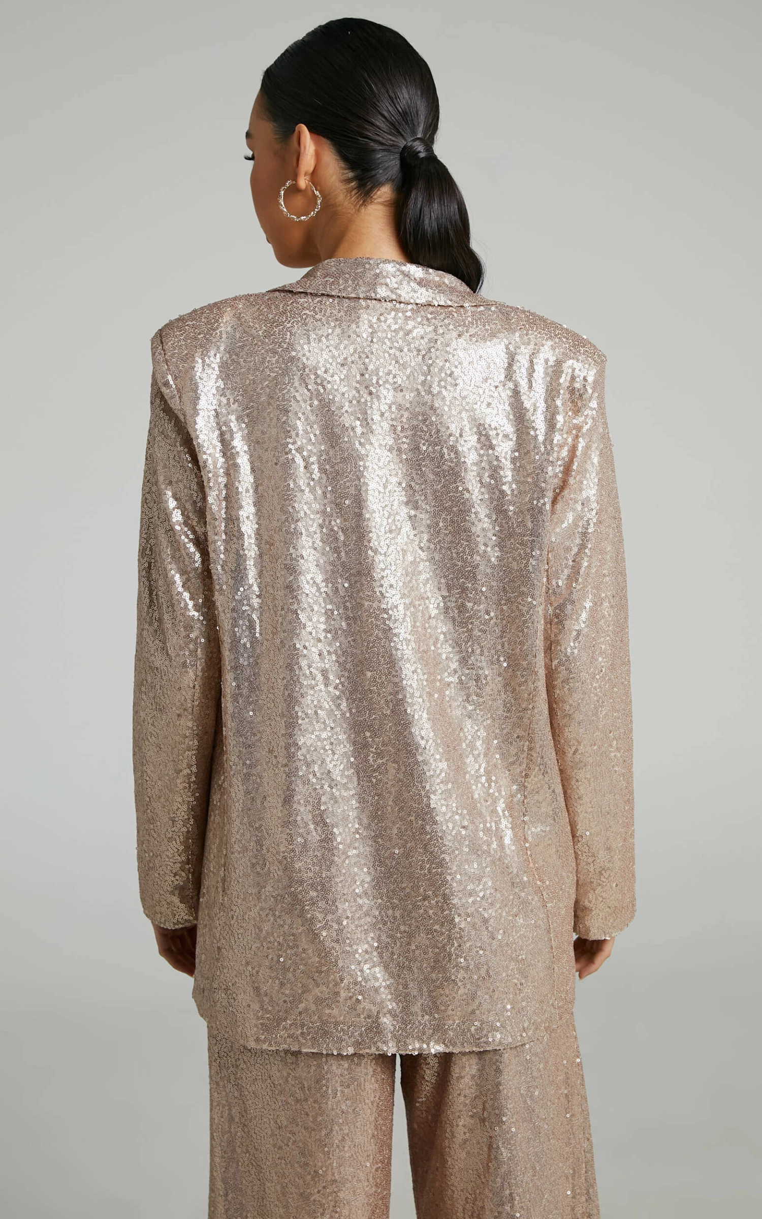 Wear yours with a bralette for a peekaboo effect and the matching Looma Sequin Wide Leg Pants in Champagne, with high heels for a jaw-dropping look!