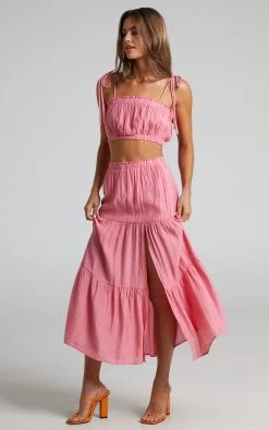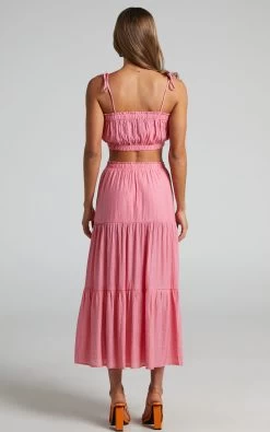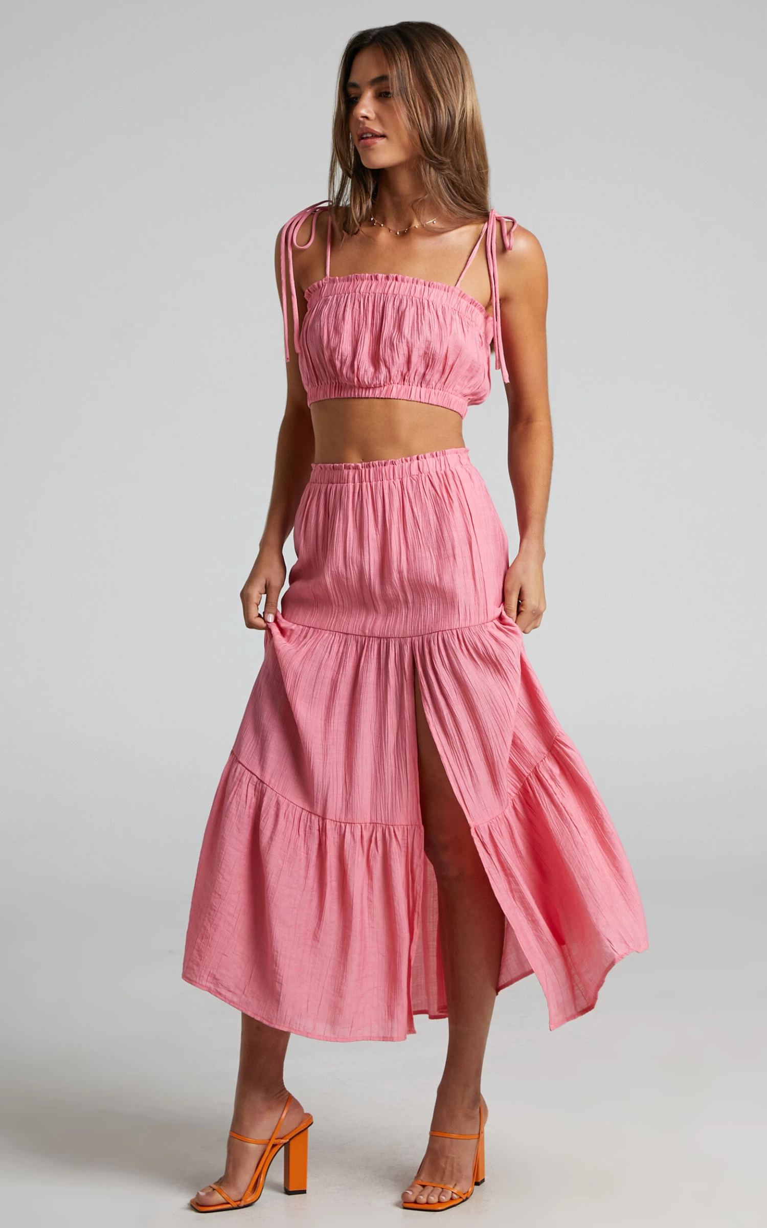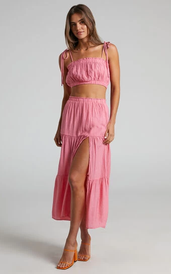 The babe vibes are real with the Mariah Two Piece Set! This pretty ensemble features a crop top with self-tie straps and frill trimming, and a tiered midi skirt with a thigh high split. It’s the perfect set for events and occasions as you can dress it up or down. Team it with some chunky sandals or mules, a mini handbag and add some minimal jewellery to complete the look!