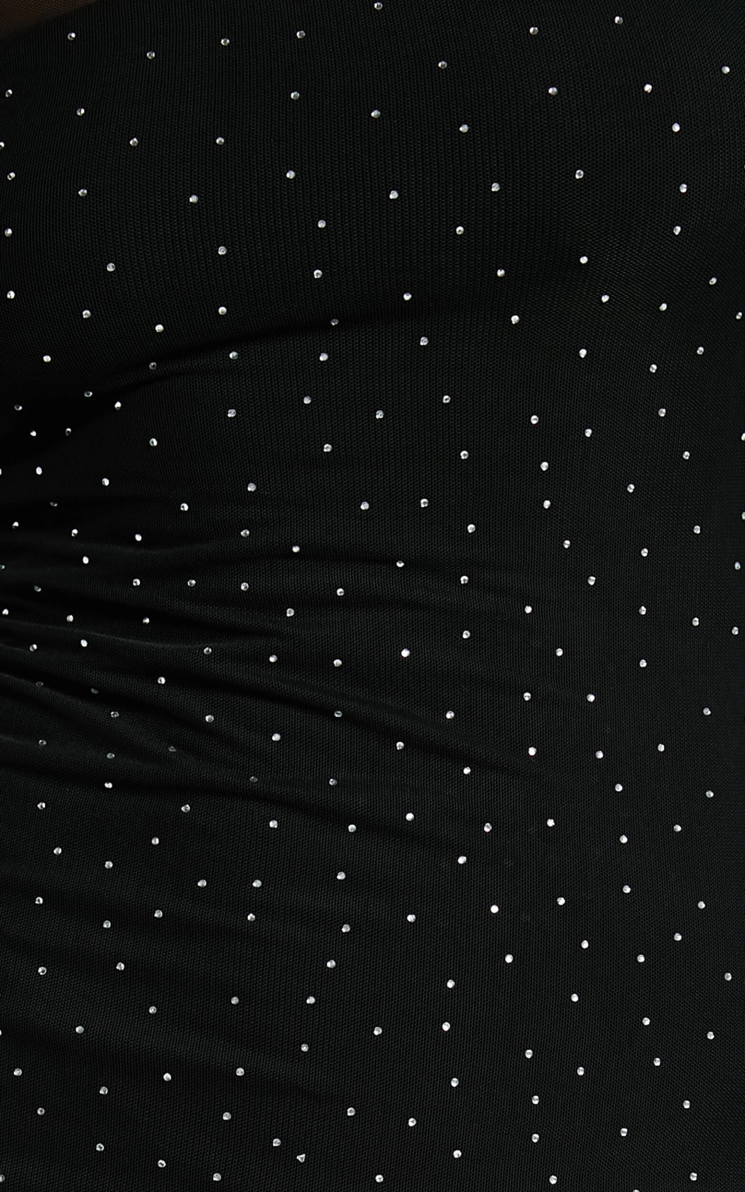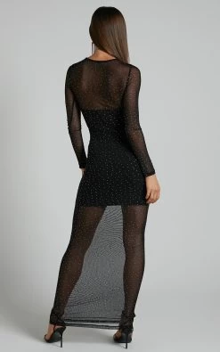 Get ready to turn heads in the Mayette Sheer Diamante Mesh Maxi Dress in black! This dress is perfect for any formal occasion and will have you feeling like a total queen. The bodycon fit accentuates your curves, while the sheer mesh and diamante detailing add a touch of glamour. The high neckline and long sleeves keep it classy, but the daring slit adds a flirty edge.