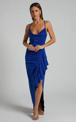 Get ready to turn heads in the stunning Mhira Cowl Neck Maxi Dress in Blue! With its elegant cowl neckline and sleek slip dress silhouette, this dress is perfect for any formal occasion. The gorgeous blue hue adds a pop of color to your wardrobe while the straight cut and sleeveless design create a sophisticated look that’s sure to impress.