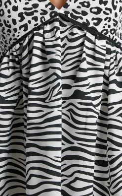 Show off your style character in this bold yet playful Michiko Mini Dress! It’s shaped with self tie shoulder straps, a low V-neckline and an empire cut waist that follows a shift inspired silhouette. It features distinctive and contrasting animal prints in monochromatic shades for a fun twist!