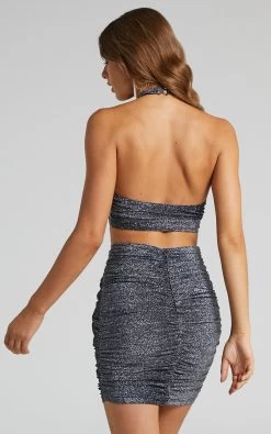 Shine through the night in the Mirna Two Piece Set! This stunning ensemble features a halter crop top with a keyhole cut out on the front and a ruched mini skirt with a twist front detail. It’s the perfect statement set to have in your collection that’ll take you from parties and festivals to dinner dates and more. Wear it with chunky boots or strappy heels, hoops and a mini handbag for a look to remember!