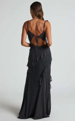 Showpo Nitha Asymmetrical Frill Thigh Slit Maxi Dress In Black Polka