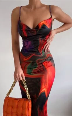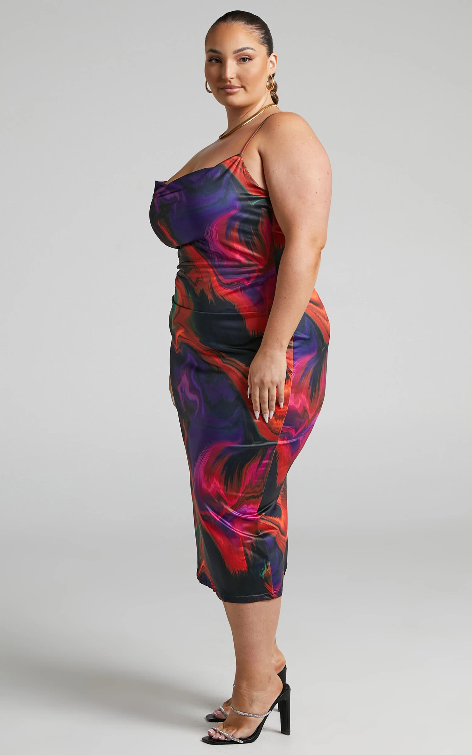 Rise to the occasion in our Rhaine Midi Dress! This eye-catching ensemble will be your go-to for party season and beyond. Featuring a cowl neckline, slim straps, bold print and flattering bodycon fit, this pretty piece will have you looking and feeling snatched all day, all night.