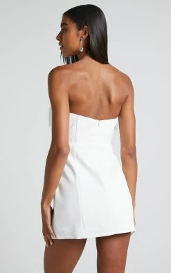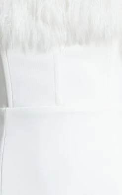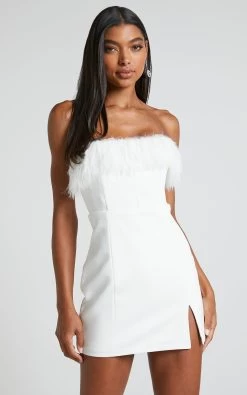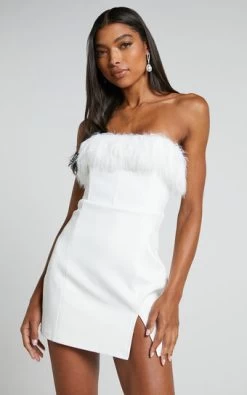 Ruffle some feathers in the Rhaiza Mini Dress! This incredible bodycon mini is all things fun and flirty. Featuring a strapless neckline with faux feather detailing, a corset-style bodice with panelled boning and a thigh split, this one is made to be seen at parties, special events, nights out and more!