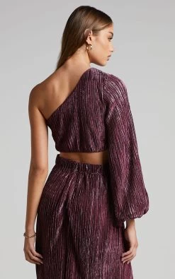 Be all that glitters with the Roellah Top! Featuring an asymmetric neckline, one-shoulder long sleeve, cropped length and lurex plisse finish, this luxe top is the perfect option for parties, nights out and more.