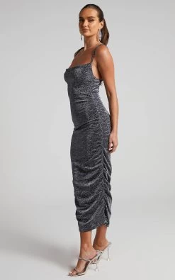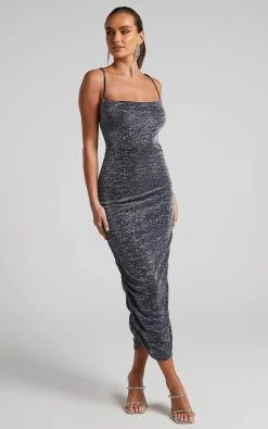 Steal the spotlight in the Roma Midi Dress! This figure-flattering midi features a subtle cowl neckline, open back, slim straps, side seam ruching and a glittery lurex finish. It’s a luxe number that was made for parties and occasions. Wear this party-ready number with dazzling jewellery and sky high stilettos then finish with glamorous makeup, and you’ll be commanding the crowd’s attention!