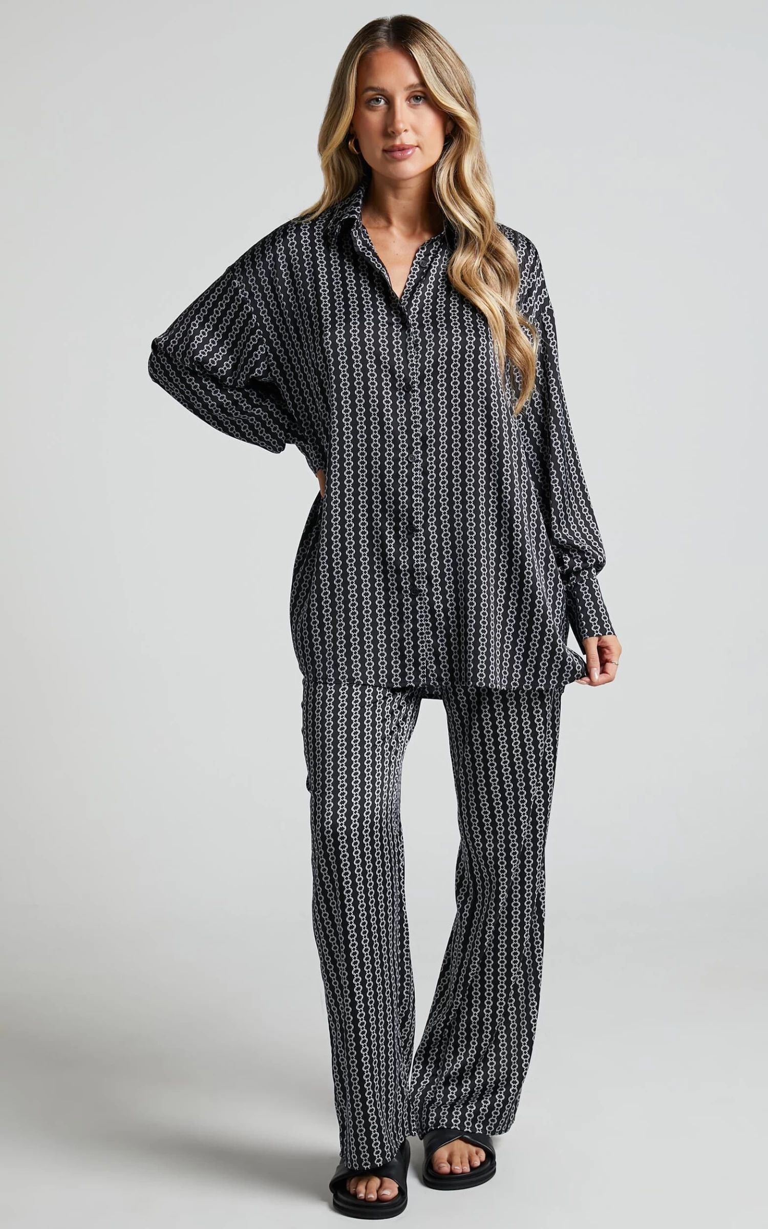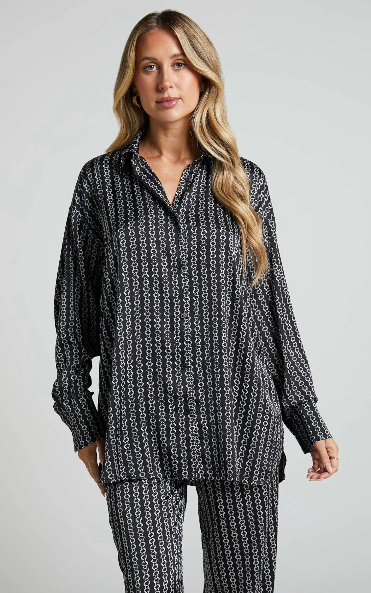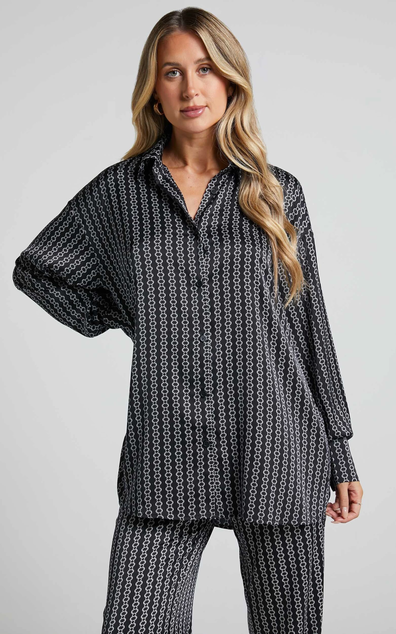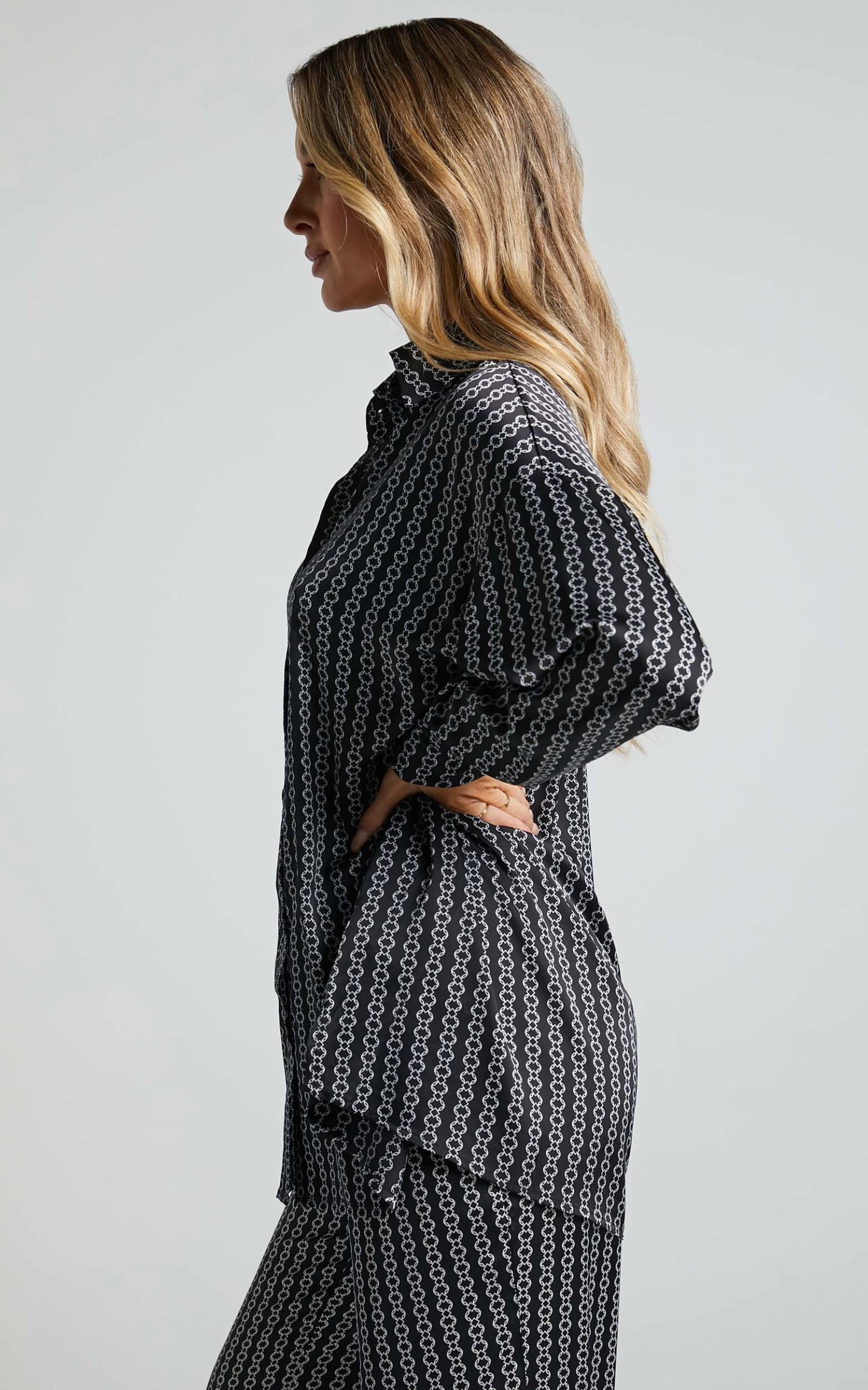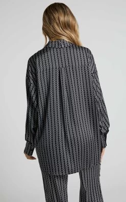 Elevate your casual wardrobe with the Rosetti Relaxed Button Down Longline Shirt in Black Chain. This versatile top features a classic collar and long sleeves, making it perfect for both work and play. The black chain print adds an edgy touch to this standard piece, making it stand out from your typical winter tops.