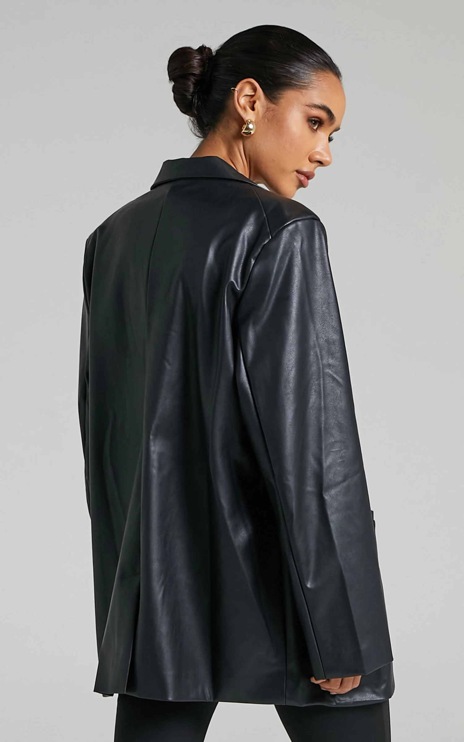 You just can’t go wrong with our Samanfa Jacket! This faux leather blazer-style jacket features notched lapels, functional buttons, long sleeves and functional pockets on the front. It has a slightly oversized and relaxed fit, and it’s the perfect transeasonal staple to have in your wardrobe. Style it with a mini dress, socks and boots for a trendy day look or keep it extra casual with a basic crop top, jeans and sneakers!