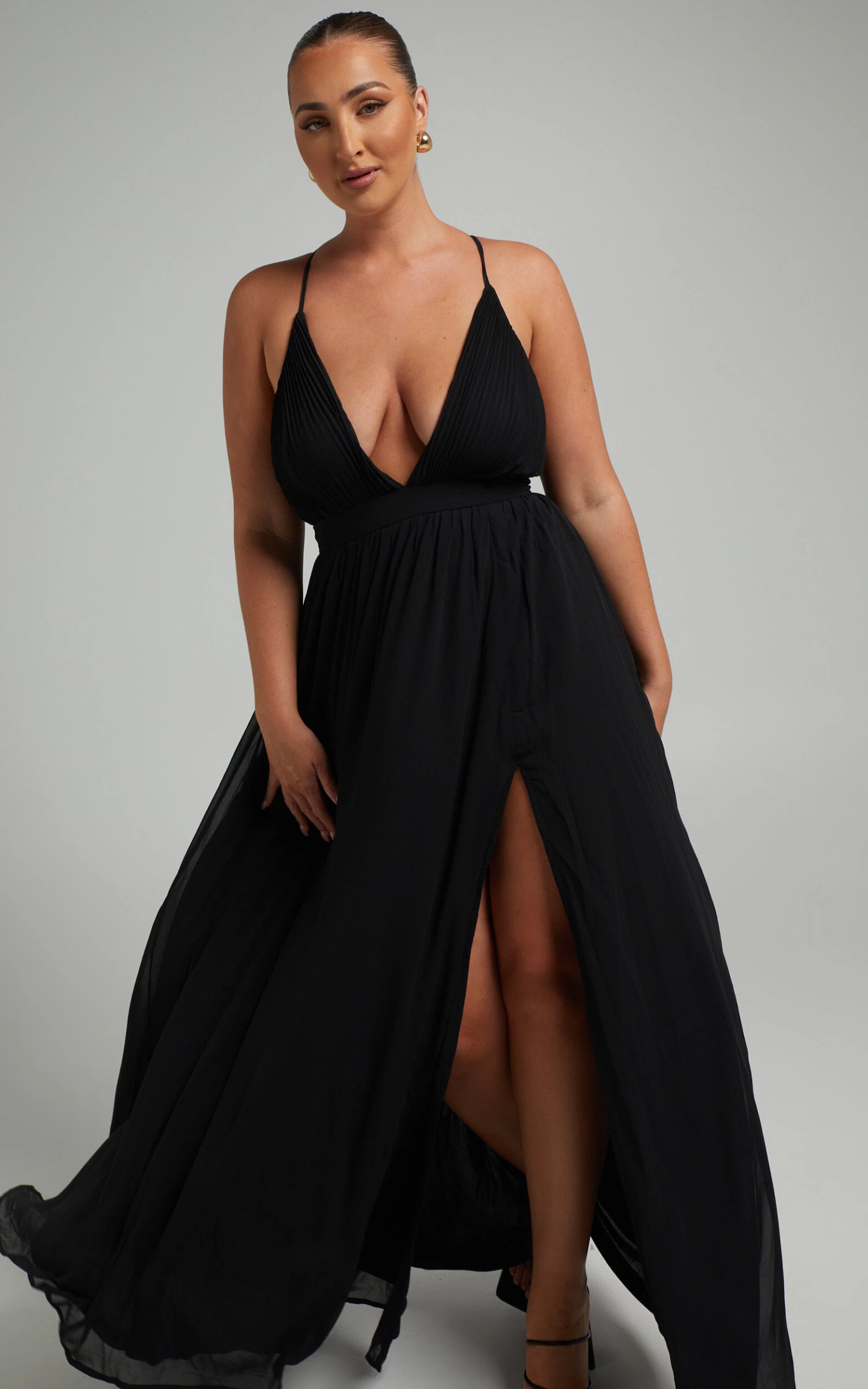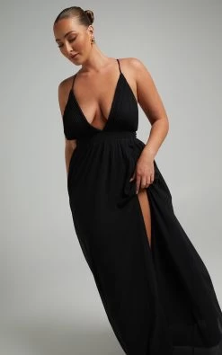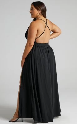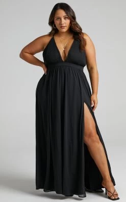 Our Shes A Delight Maxi Dress expresses an air of confident femininity with it’s flowy gathered skirt. It’s constructed with a plisse bodice, and shaped with a plunging neckline and slender shoulder straps that form a cross over at the back. The waist is defined with a fitted waistband and finished with a deep thigh high split for gracious movement with every step. It’s ideal for upcoming weddings and other special occasions – pair it with some heels and a mini handbag to complete the look!