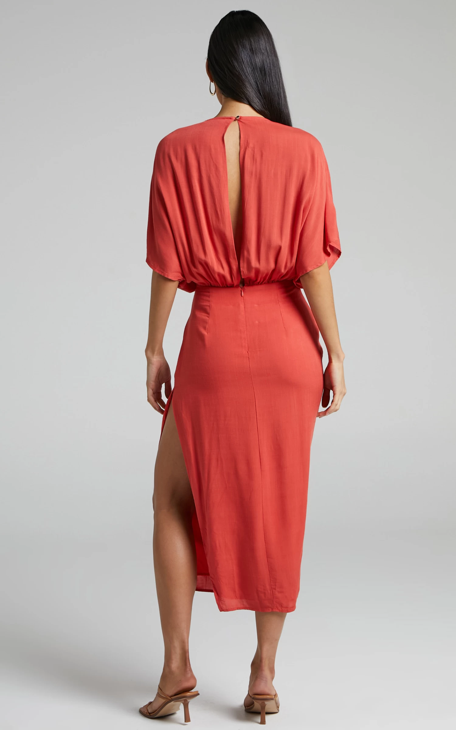 You + our Sunshine Dress + a cocktail in hand = a major summer vibe! This gorgeous midi features a plunge neckline with short angel sleeves and straight fitted skirt with a thigh high side split. It’s flirty with a touch of classy, and perfect for a day date. Team it with heeled sandals, hoops and throw your hair up in a slick back bun for a polished finish!