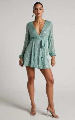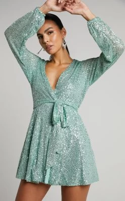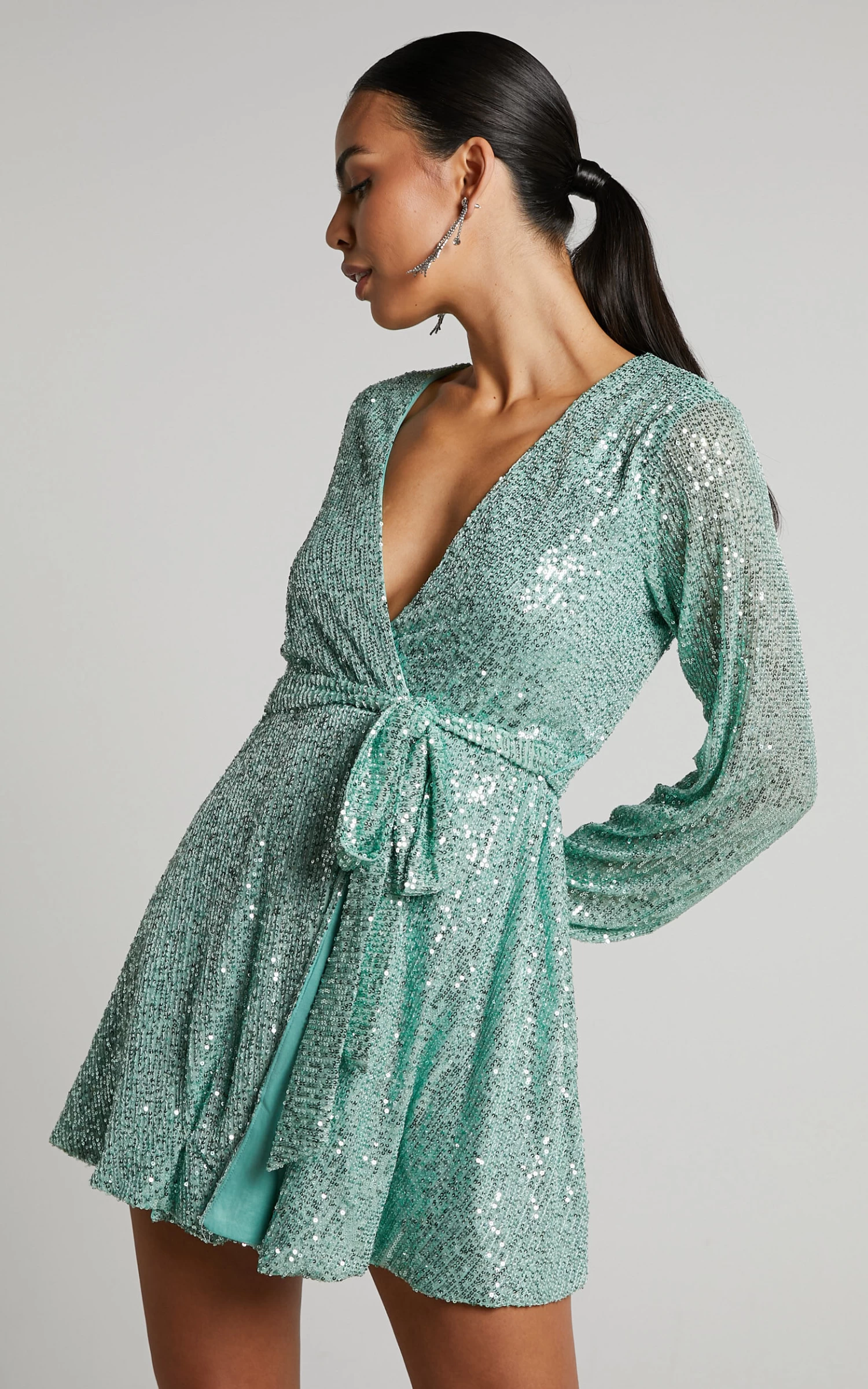 Stand out from the crowd in the Three Of Us Dress! This gorgeous sequin mini features a plunging neckline, long sleeves and an elasticated waist with a tie detail. Glamorous and relaxed, it’s a piece you’ll never want to take off! Pair it with your favourite heels and jewellery for a hot party look!